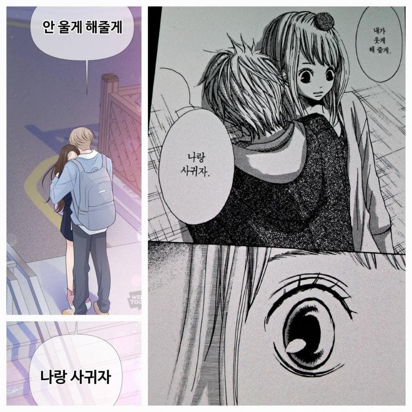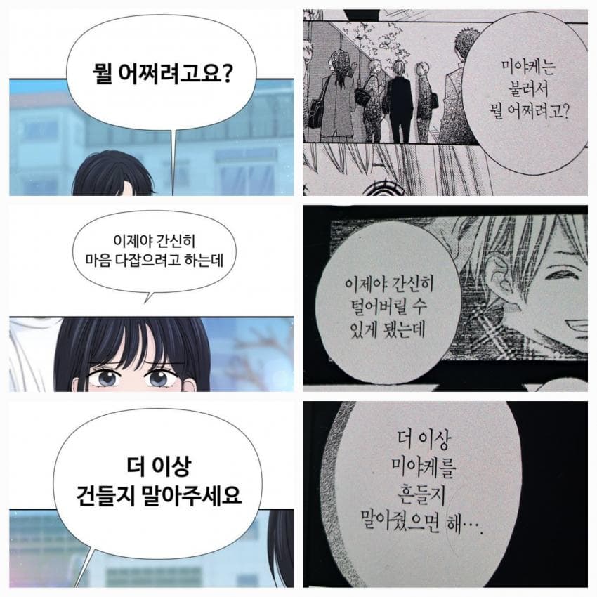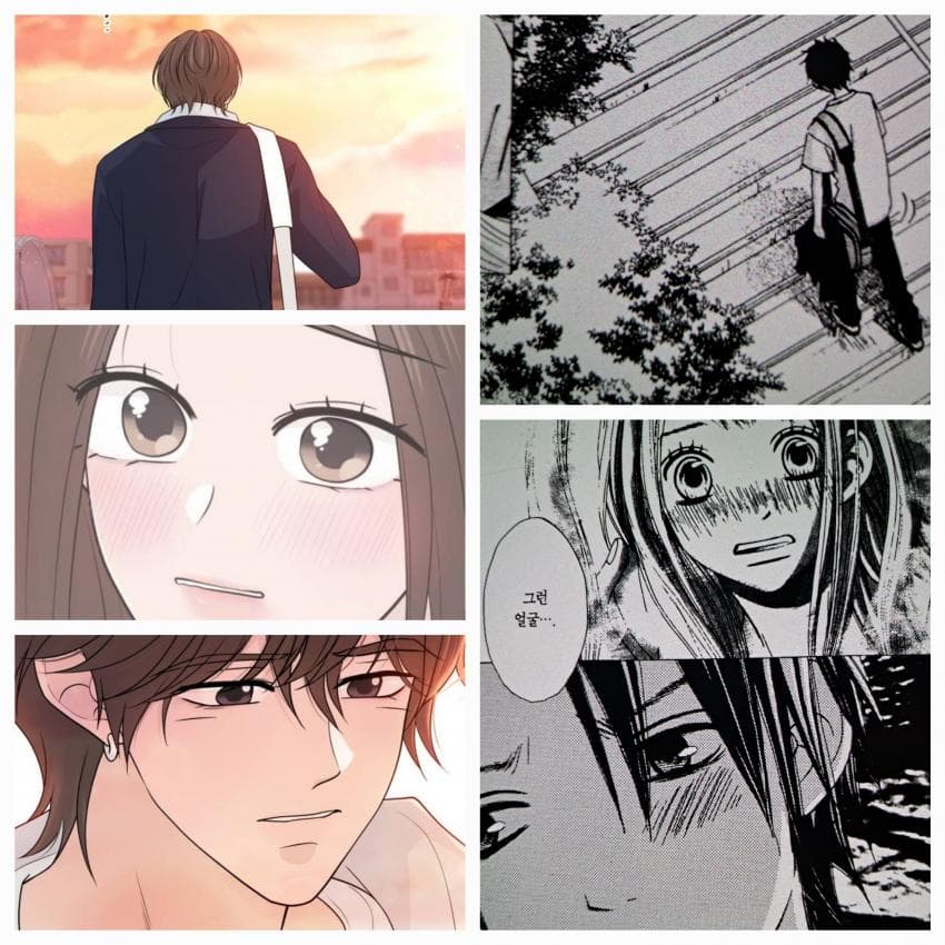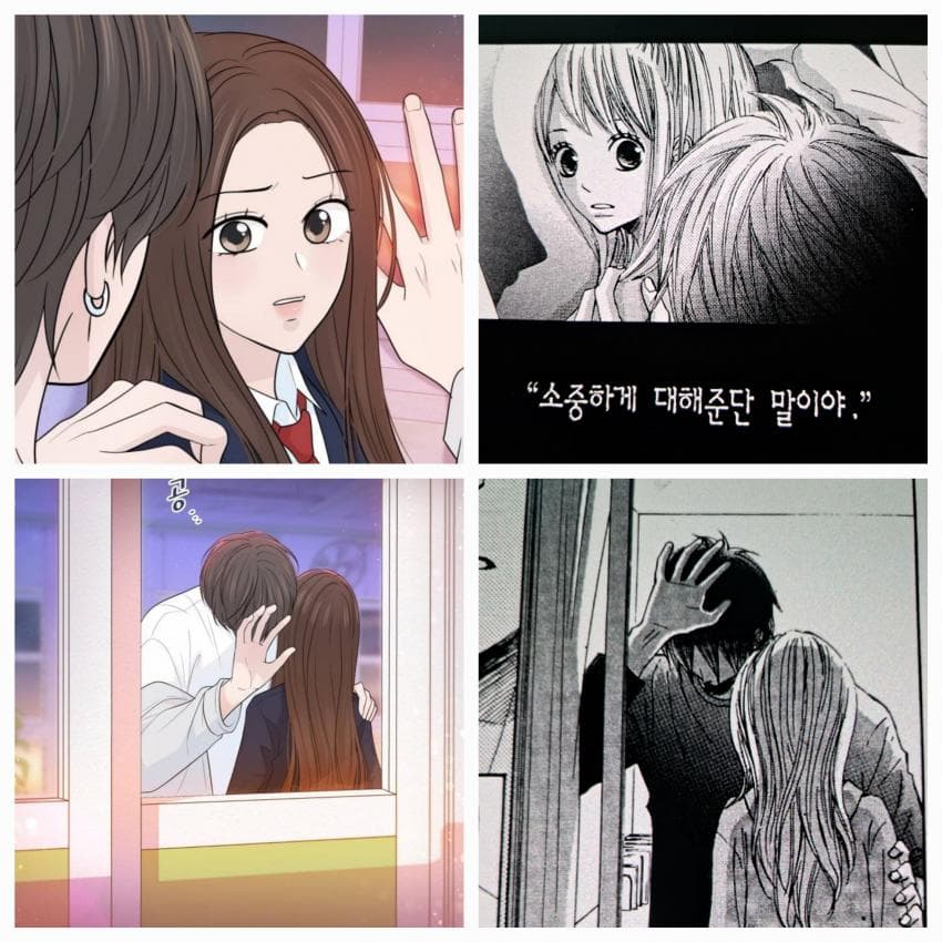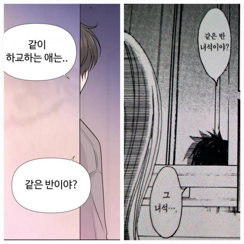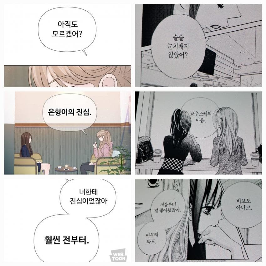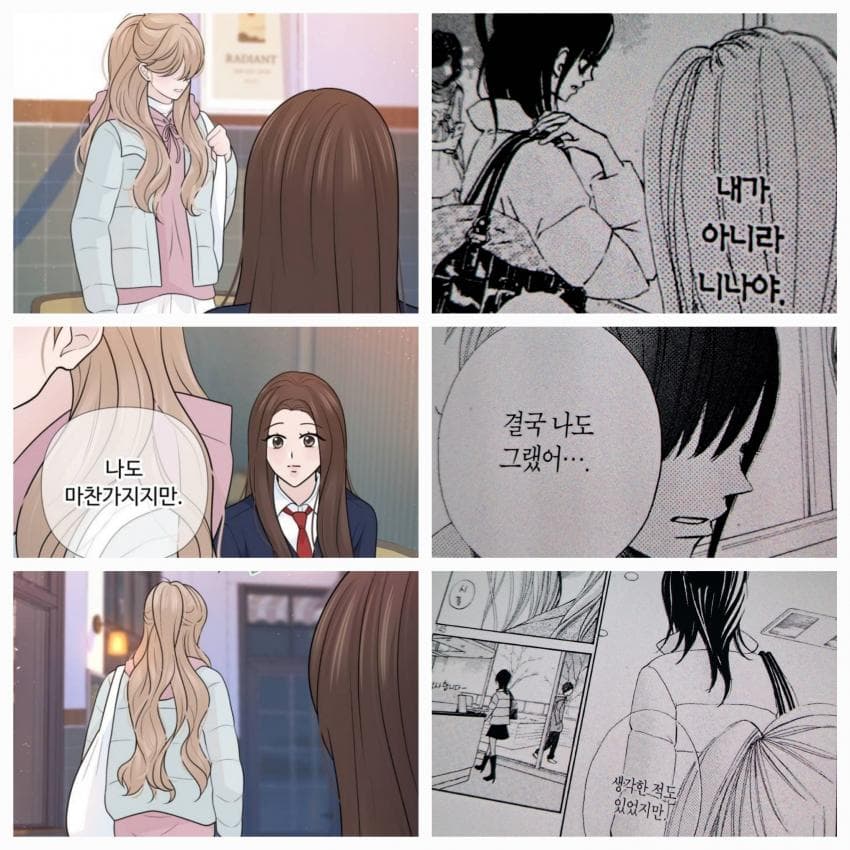 왼쪽이 웹툰 <고백 취소도 되나?> (신매, 2022~2023) / 오른쪽이 일본 만화 <네 곁의 나> (난바 아츠코, 2009~2012)