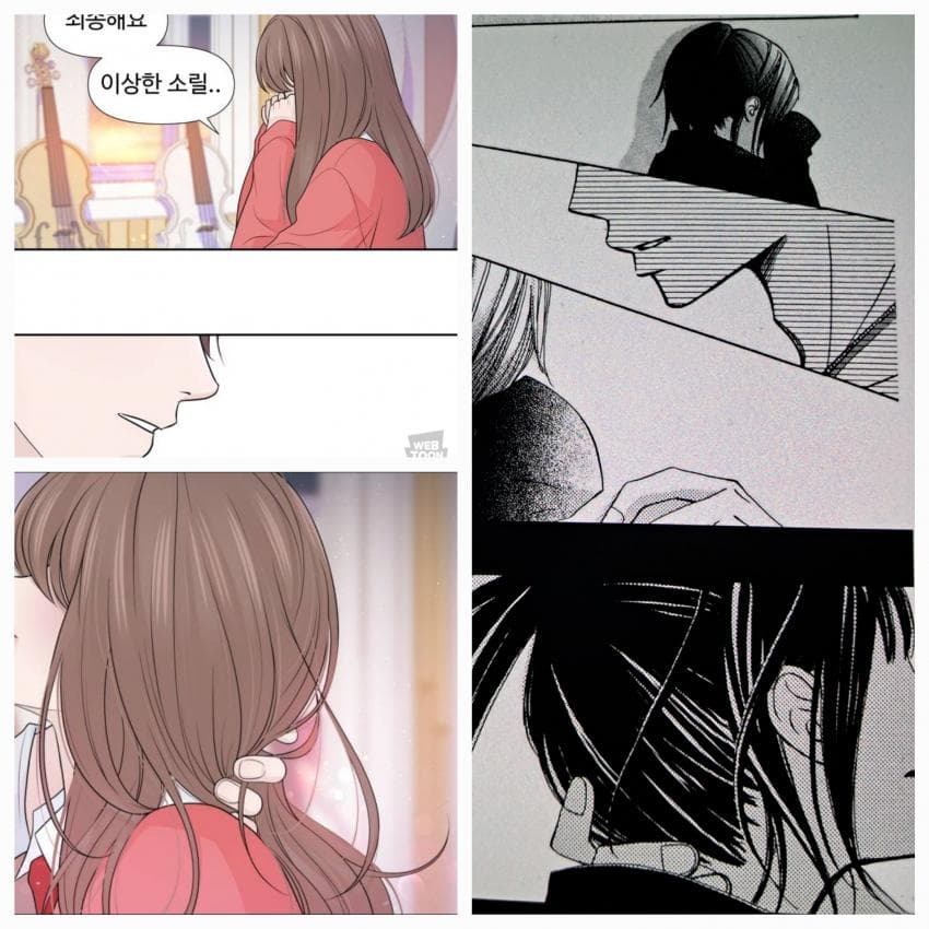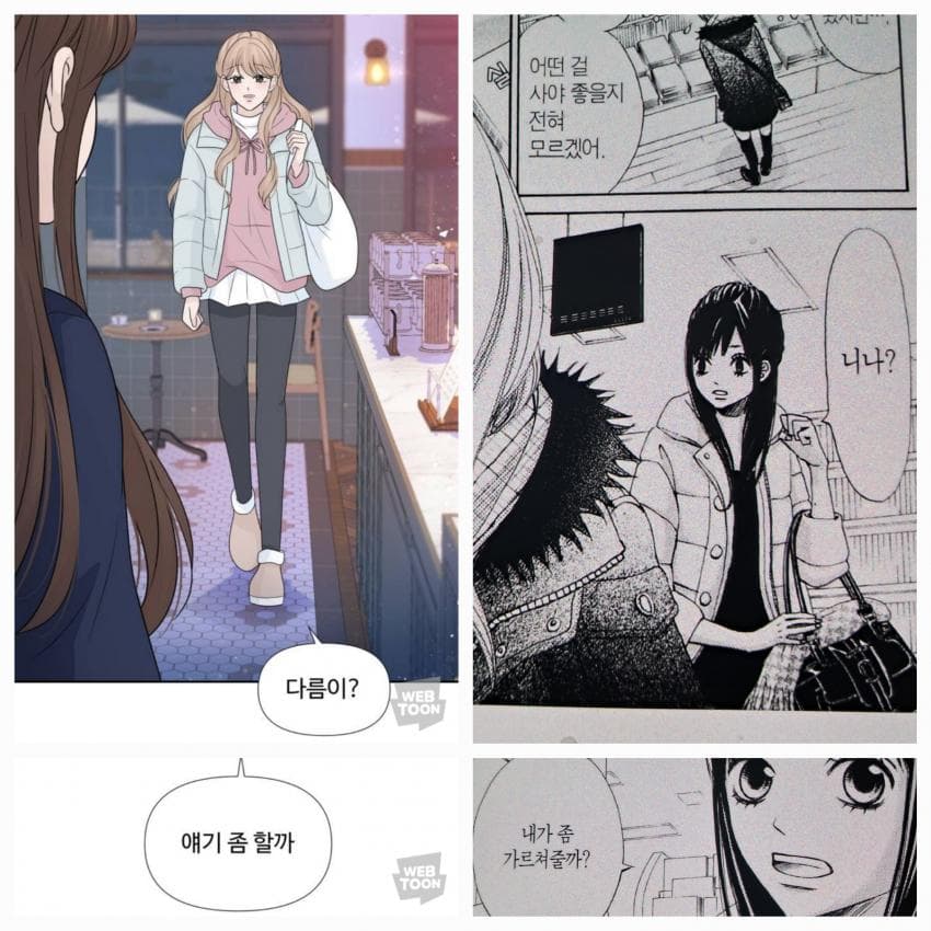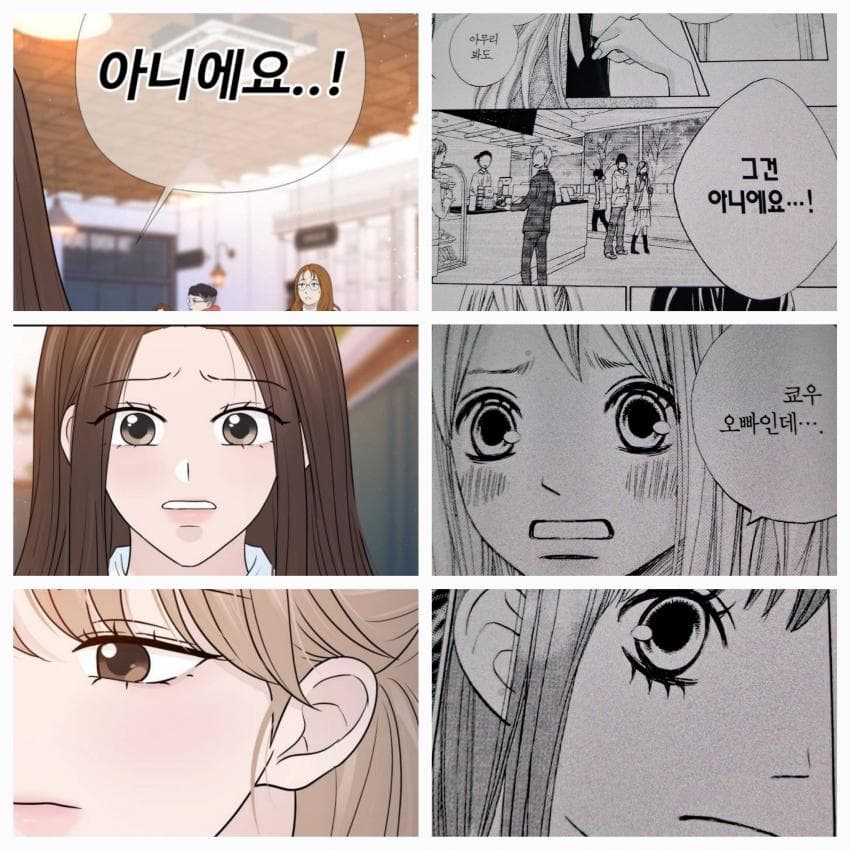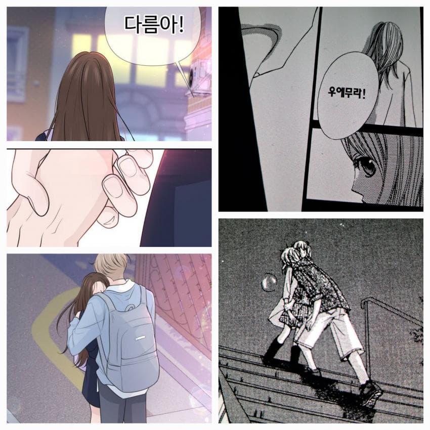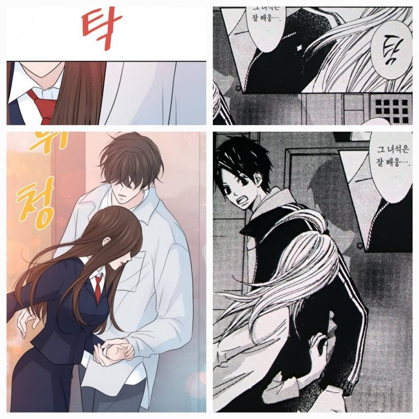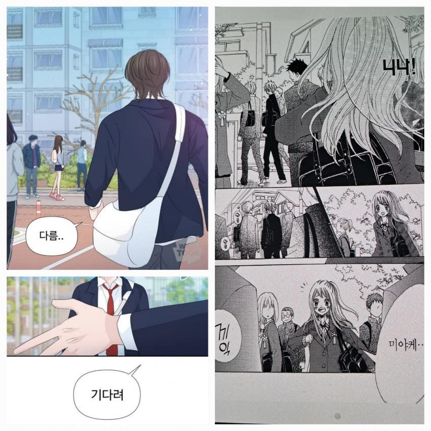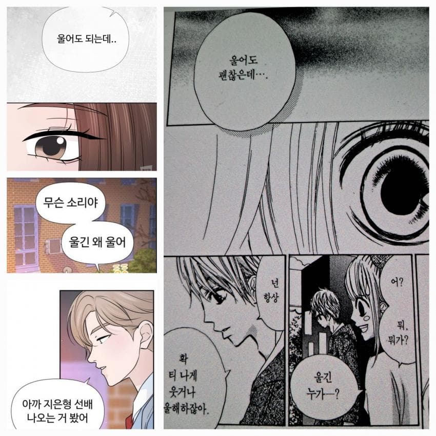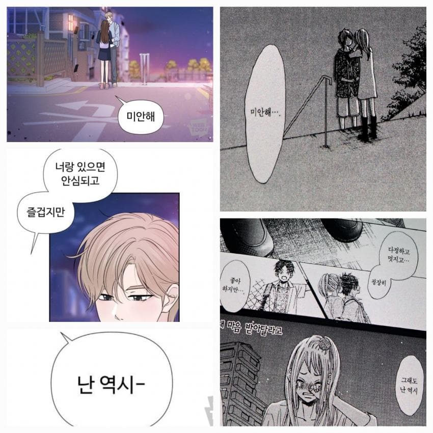 왼쪽이 웹툰 <고백 취소도 되나?> (신매, 2022~2023) / 오른쪽이 일본 만화 <네 곁의 나> (난바 아츠코, 2009~2012)