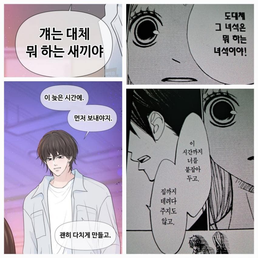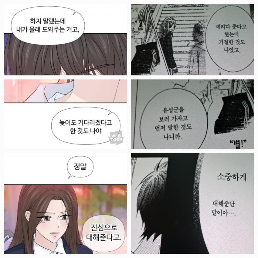 특히 웹툰의 끝부분... 72화, 마지막화 심지어 외전 1화마저도 내용을 전부 베낀 것을 보니 화가 나더군요. (네 곁의 나 10권 참조)