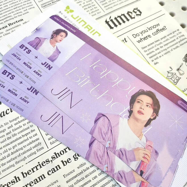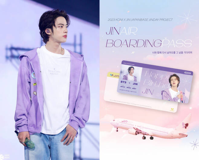 지난 11월 10일부터 인천과 부산에서 출발하는 진에어 항공편에서 한국 홈마스터 KONI(@btsforever1207)가 디자인한 방탄소년단 진의 사진이 프린트된 탑승권 발급이 시작됐다.