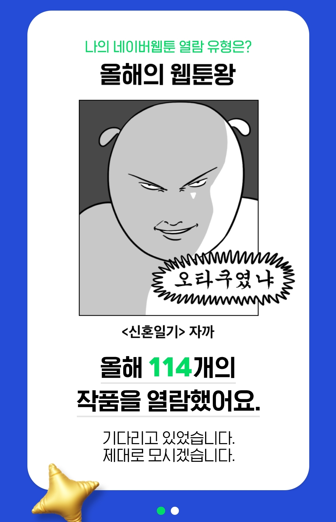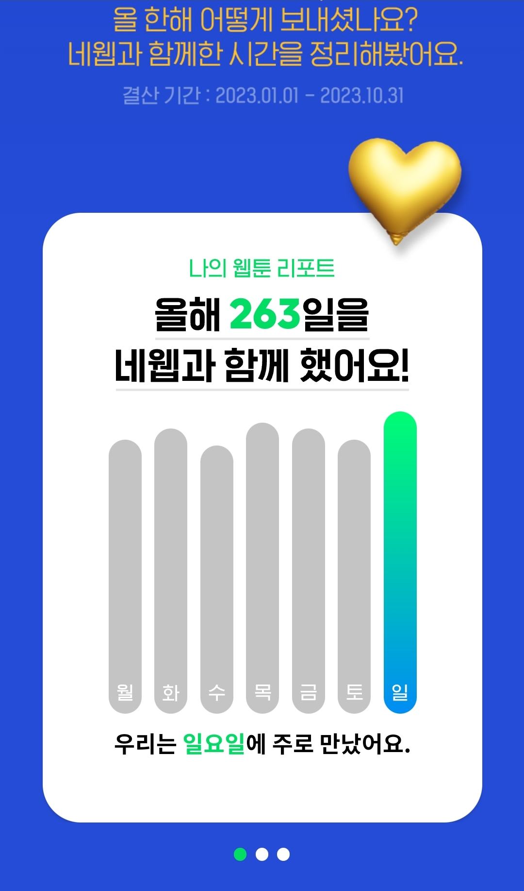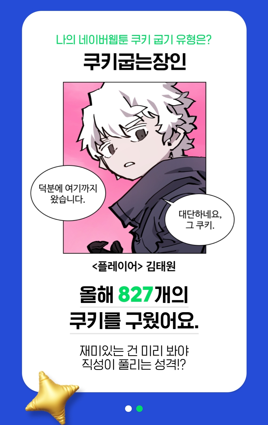 [기타]2023년 네이버웹툰 리포트 결과 확인해보자! 작성자롤로노아 조로|작성시간23.12.01|조회수4,909 목록 댓글 25 글자크기 작게가 글자크기 크게가 https://m.comic.naver.com/event/yearend/20232023 with WEBTOON올해 나는 웹툰을 얼마나 봤을까?webtoon.onelink.me가보자고https://m.comic.naver.com/event/yearend/20232023 with WEBTOON올해 나는 웹툰을 얼마나 봤을까?webtoon.onelink.me 다음검색 현재 게시글 추가 기능 열기 북마크 공유하기 신고 센터로 신고 댓글 댓글 25 댓글쓰기 답글쓰기 댓글 리스트 작성자LACOSTE | 작성시간 23.12.02 헐 쟈밋다 작성자카이저 | 작성시간 23.12.02 내가 쿠키를..? 심지어 256개나..?? 하고 스크롤 내렸다가 납득완 (〃⌒▽⌒〃)ゝ정년이는 기다무를 기다릴 수가 없었잔아 이미지 확대 답댓글 작성자카이저 | 작성시간 23.12.02 아끼발 답댓글 작성자카이저 | 작성시간 23.12.02 닉넴 나와서 호다닥 가리기 완이참에 닉바꾸고 와야지 작성자라라루루 | 작성시간 23.12.02 나 쿠키 완전 많이 구운줄 알고 왔는데..... 눈아들 대단해 ㄷㄷ 이미지 확대 댓글 전체보기
