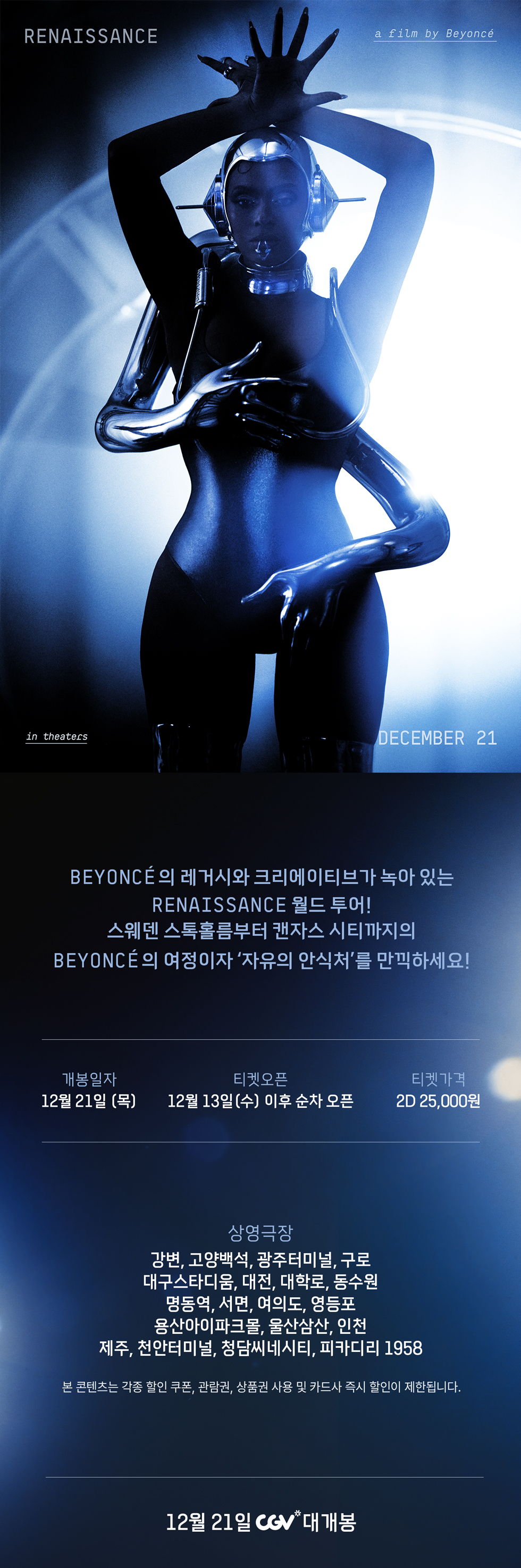영화 <RENAISSANCE: A FILM BY BEYONCE>는 RENAISSANCE 월드 투어의 첫 공연이었던 스웨덴 스톡홀름부터 피날레 공연인 미국 미주리 주 캔자스시티까지의 여정을 모두 담고 있다.