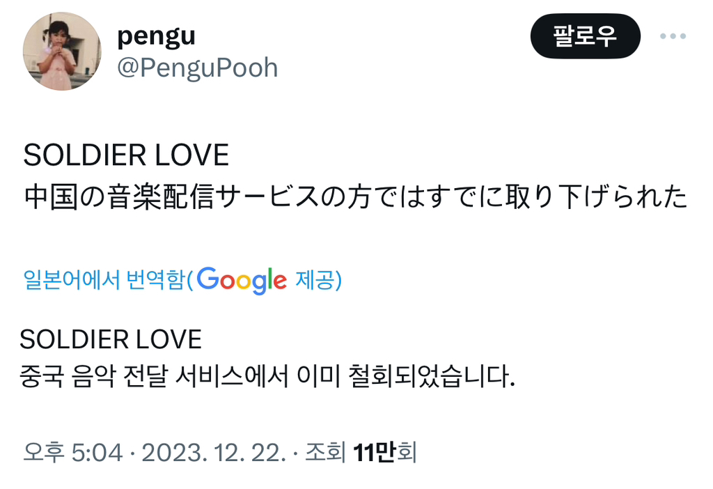가사 때문에 중국은 음원까지 내려간 상황까지 옴