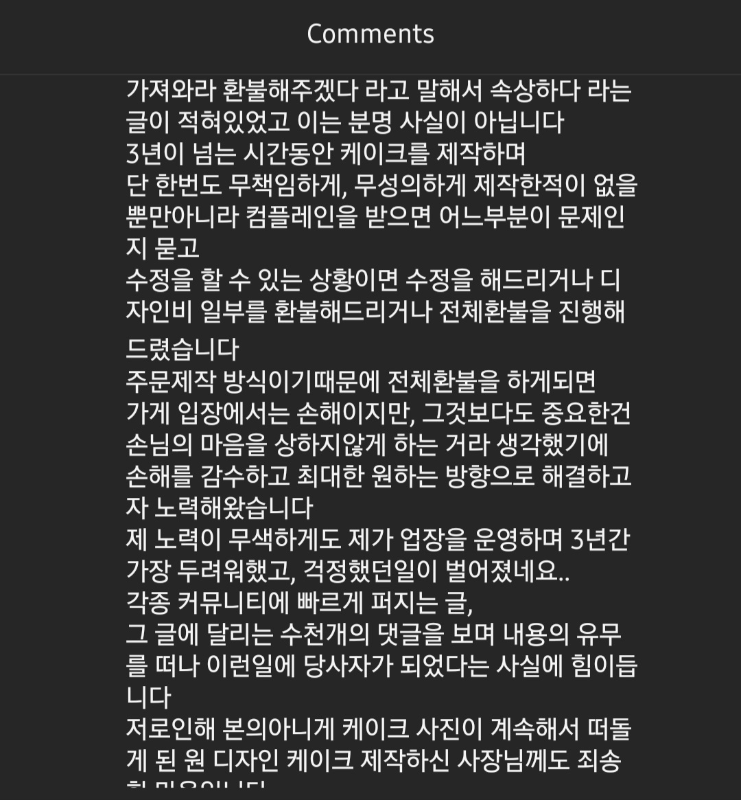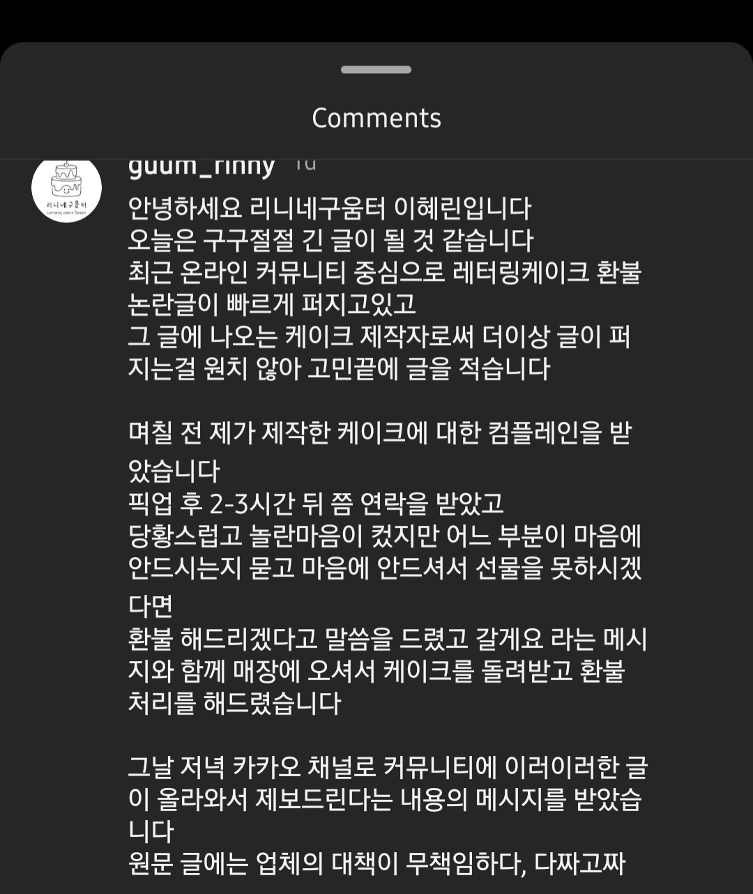 [기타]레터링케이크(ㅇㅅ에 올라온 업체) 사장님 인스타 업로드 작성자프라이드양념치킨|작성시간24.02.05|조회수5,136 목록 댓글 42 글자크기 작게가 글자크기 크게가 폐업하신다고 함.진짜 개진상이 따로 없다https://m.cafe.daum.net/baemilytory/91cd/956648?svc=cafeapp레터링 케이크 논란https://www.dmitory.com/issue/308400792 응대도 잘 해줬고 환불까지 해주신다는데도대체 저기서 뭐 얼마나 더해야 하는거지?첨부터 그디자인을 원했음 그 업체에 가야지m.cafe.daum.net이글 보면 돼. 다음검색 현재 게시글 추가 기능 열기 북마크 공유하기 신고 센터로 신고 댓글 댓글 42 댓글쓰기 답글쓰기 댓글 리스트 작성자버물리 | 작성시간 24.02.05 아 너무 속상하다 작성자이자요이 | 작성시간 24.02.05 개불쌍해 작성자갓생산다 | 작성시간 24.02.06 4가지없는 손님아 꼭 천벌받아라^^ 작성자햄볶 | 작성시간 24.02.06 욕해달라고 글쓴거 그 이상도 이하도 아닌 거 같음 진짜 개너무하다 작성자김지찬 | 작성시간 24.02.06 아이고…… 댓글 전체보기