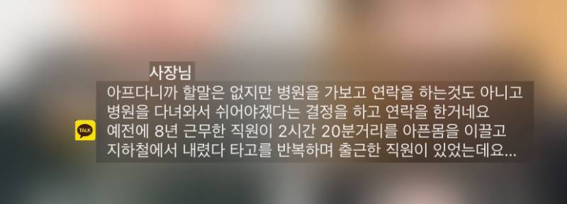 작성자KOYA 작성시간 24.03.15 언니가 얘기해준건데 교통사고 나서 응급실이라니깐 그래도 사무실 와야하는거 아니니냐던 언니의 직장상사가 생각나는구만