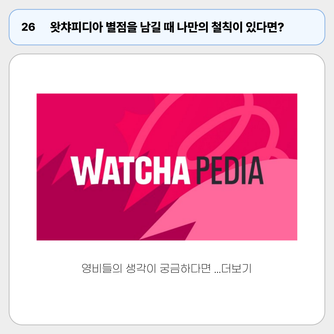| 마음이 시키는대로 재밌네~ - 3점 / 재밌다... - 3.5점 5점은 가슴이 시킨다 영화 보자마자 바로 남기는 것! 남들 후기나 해석 아무것도 안 본 채 내 마음이 시키는 대로 바로 매김 왓챠피디아를 안 써요... 처음 남긴 별점이 맞다 5점은 마음이 시켜서 한다..! 보다가 오열한 영화는 높은 별점을 줍니다🥹⭐️ 4점 이상은 마음이 시키는대로 여태까지 남겼던 별점과 비교해 조정한다! 5점은 누가 좋든 싫든 내 영혼을 울리면 주는 것 1.0 이하는 안 줌 영화가 아무리 별로여도 제작에 참여한 사람들이나 배우들을 봐서 1.5점부터 시작 2.0이 최하인데 거의 주는 경우가 없다. 만든이의 노고를 생각해서... 별점은 가슴이 시킨다...☆ 따끄 갓섬이 뛰는 작품에 5점 5점은 정말 내림이 옵니다 다른 이들이 이래서 3점 이래서 4점 이래도... 나만의 기준에만 부합하면 무족권 5점...! 그리고 아무리 구려도 2점 이하는 잘 주지 않습니다요 1점 미만으로는 안 주려고 하고 감상이 오래가지 않아서 영화 보고 바로 남기기 5점은 내 심장을 뒤흔들어야함 크게 없다 n차 할 만 하다고 생각하는 영화는 4.0 이상으로 주잔아 | 별점 주고 나서 반나절 후에 다시 생각하여 매긴다...그러면 0.5점 떨어지는 경우가 많은데 그게 내 마음속 진짜 점수 같아요 여성 주연, 여성 감독, 여성 서사 작품엔 + 0.5 내눈에서 눈물을 뽑았느냐 다른 사람들 후기에 흔들리지 않기!! 5점 기준이 '내 마음을 울리는 장면이 있고, 몇번을 봐도 안 질리고 재개봉하면 달려가서 볼 영화'라서 5점 준 영화가 다섯개도 안 되잔아 왓피를 안 써요..... 그냥 마음이 시키는대로... 여성 서사면 1점은 무줙건 먹고간다 일주일후에 다시 생각해보기 무난~평잼 - 3점 / 할 얘기가 많거나 흥미로움 - 3.5점 / 심장이 뜀 - 4점~4.5점 / 벼락처럼 내려오는 - 5점 (거의없음) 짧고 간결하게 쓰려고 한다! 명대사 적는 것도 좋아합니다 남들의 평가에 휘둘리지 않기 특히 이동진 왓챠피디아에 별점을 안남긴다..!ㅎ가 슴이 시켜야 5점 주기, 빻은 대사가 한 문장이라도 있다면 0.5점 감점 딱히 없음 남의 평론에 휘둘리지 말것 3점은 킬타로 괜찮았던거 그 이하는 .. 비추 영화 그 이상은 재밌는거! 왓챠피디아 아니더라도 한줄평 작성해 두기 3.0(ㄱㅊ 남들한테 추천 가능) 기준으로 조정함 |