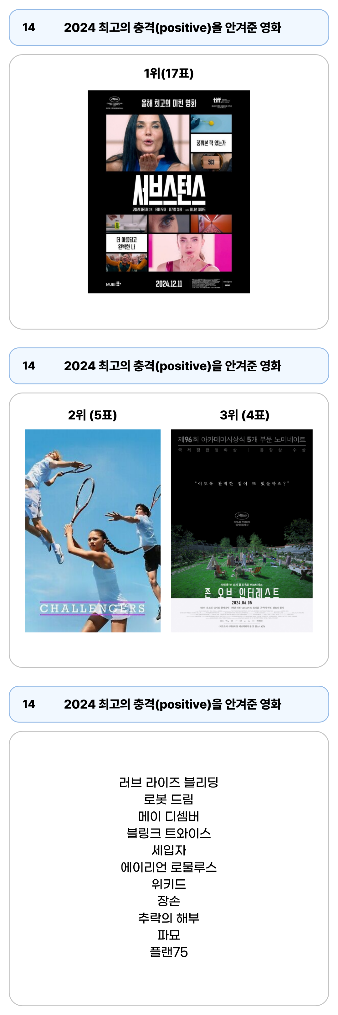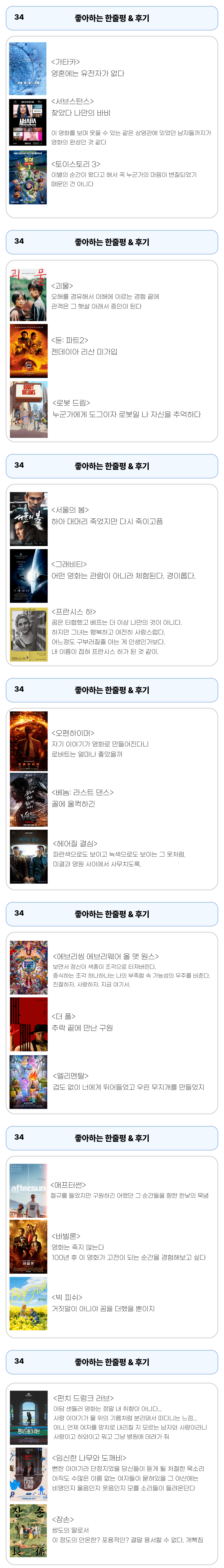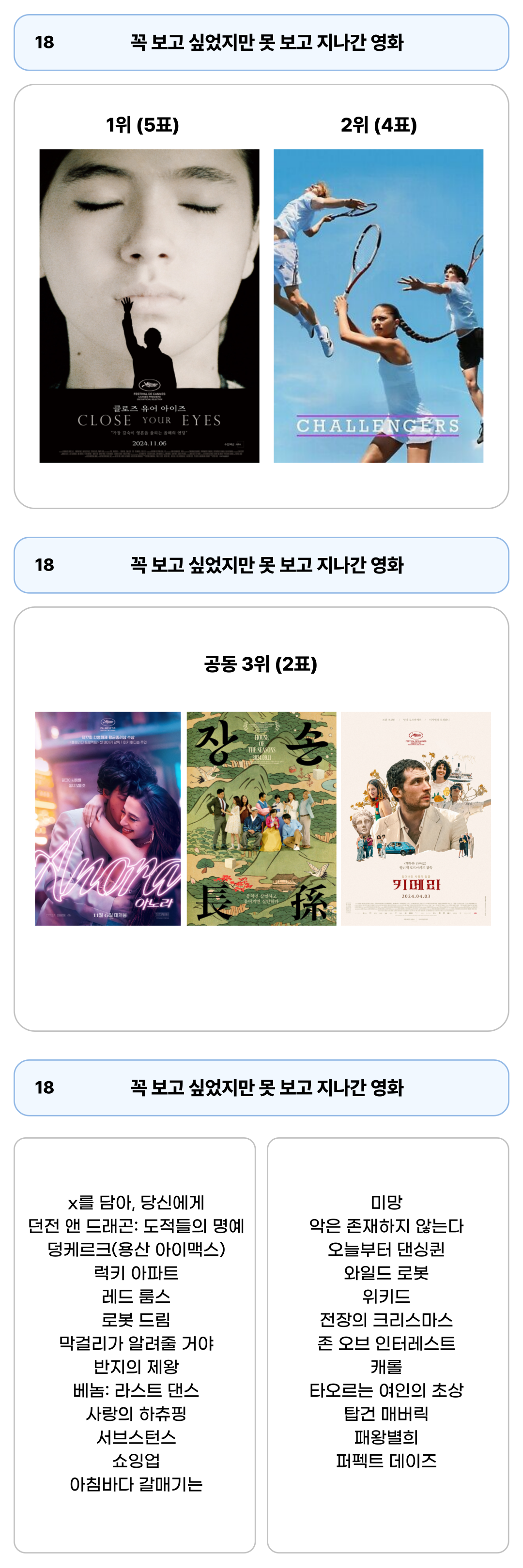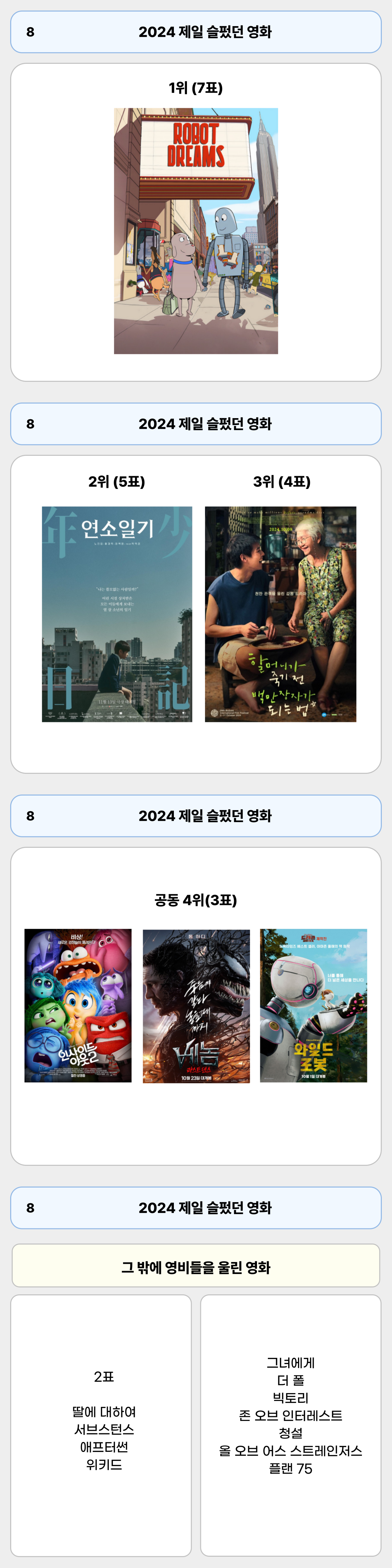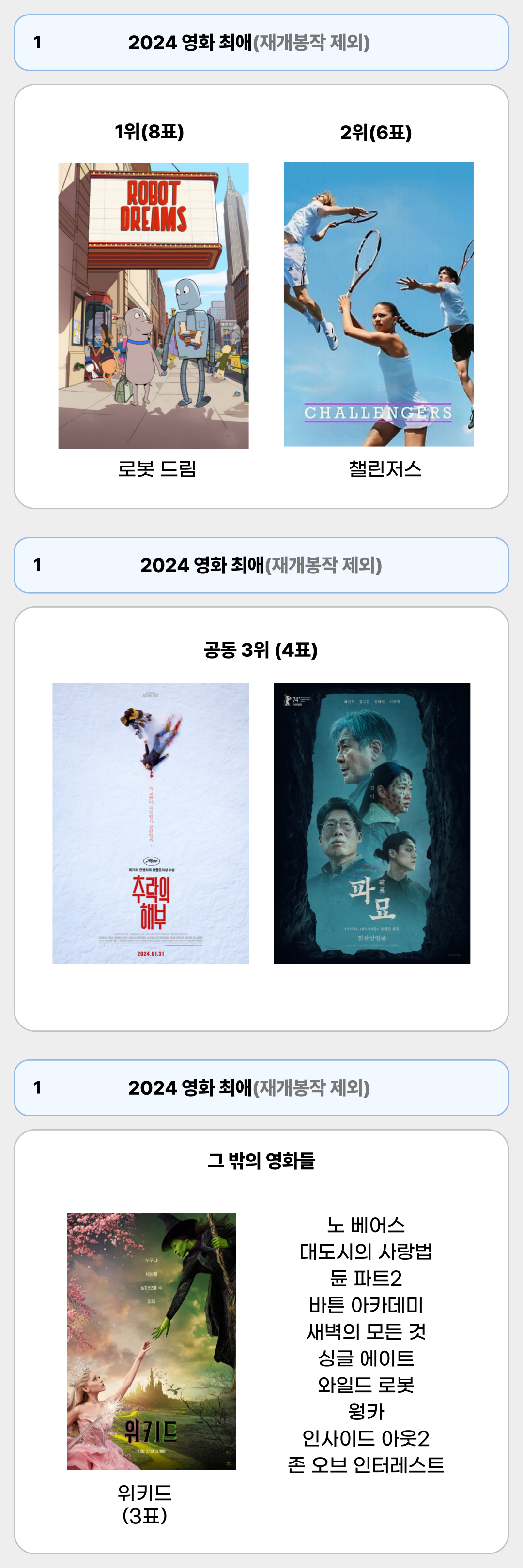 | 얘들아 우리 죽을때까지 평생 같이 영화 좋아하고 영화 함께 보는거야 올해는 원데이프패 미리미리 쓰걸아 항상 같이 영화 얘기해줘서 고맙잔아 2025년에도 잘 부탁합니다💙 영비들 없었으면 어디가서 영화 작품 얘기하고 또 몰랐던 영화들도 얘기하고...빡치는거 얘기하고 맛있는 매점 라이프를 이어갈 수 있었을지 상상이 안되잖아 다들 하는 프모마다 원활하게 성공하고 관크없고 즐거운 영화인생을 살았으면 좋겠다 새해 복 많이 받아🍀 올해는 영비들 모두 부디 모두 따뜻하고, 영화로운 나날들 보냈으면 좋겠잔아! 다들 새해 복 많이 받아🤎 다들 사랑해 올해도 좋은 영화와 함께해요 너무나 ㅈ 같은 세상에서 영화라는 공통된 한 가지를 같이 좋아하고 얘기할 수 있는 너희들이 좋아 행복하자 영타쿠똥꼬영비들아💩💕 영생살아 영비들이 영화 보기 좋은 세상 만들어줄게🥹🕯️ 같이 영화를 좋아하는 온라인 친구들이 있어서 너무 좋아. 앞으로도 함께하자. 영비들아 2025년도 건강하게 영화 많이 보자🍿 덕분에 영화 더 재밌게 보면서 행복했잔아 다들 올해도 즐거운 영덕질해보자고 2025년에도 하고픈 일 다 잘 되길 바라고!!! 앞으로도 영화 얘기 많이많이 하자 🎬🍀🦋💙 원래 그렇게 영화 보는거에 큰 관심이 있지는 않았는데 관심을 가지게 되고 취미로 삼으면서 영비들이랑 같이 얘기 나누니까 문득 영화를 취미로 삼은 내가 너무 좋아졌잔아. 영화를 사랑하게 되는데는 영비들의 힘도 진짜 크잔아! 비슷한 가치관을 가진 영비들과 영화 얘기 나누니까 영화를 조금 더 잘 느끼게 되고 영화 음악 등과 같은 다른 요소에도 눈이 뜨이고 귀가 트이는거 같아. 영비들 정말 고마워!! 영비들이맘놓고영화를사랑할수잇는세계가찾아오길🙏🏻 나에 영화친구 영비들아 🎬 올해도 달글 열심히 달려줘서 고맙잔아 난 사실 영달 달린지 1-2년정도밖에 안됐는데 너희 덕분에 영화를 더 많이 사랑하게 된거같아 똑같은 취미를 가진 누군가와 취미를 공유한다는게 얼마나 행복한 일인지 너희 덕분에 알게됐다잔아 25년에도 잘부탁해 사랑해 영비들 🍿❤️ 영비들아!!! 내가 요즘 바빠서 달글은 잘 못가지만...짬짬이 들르면서 넌에 뭐하나 한번씩 보고 간단다 그럴때마다 변함없이 영화 이야기로 가득가득한 달글 보면서 안심을 해 영화 얘기를 언제든지 할 수 있는 곳이 변함없이 항상 그곳에 있는 것 같아서 막 든든한거 먼지 아냐? ㅋ 여튼 그렇다고 😁 내가 영화 얘기 시작하면 숨 못쉬고 우다다다 말하는 오타쿠마냥 말하지만 이 달글에선 그런 놈이 나 혼자가 아니라는 사실에 정말 아무 엄청난 듬직함을 느끼고 있어 항상 고마워!!! 그니까 앞으로도 나랑 숨 못쉬고 우다다ㅏ 말하는 씹덕톡을 나랑 해줘야된다 알겟지 어디가지말고!!!! 노잼 영화 얘기도 너네랑 하면 좋단 말야!!!!!!! 왜 노잼이엇는지 말하면 그것또한 즐거움 그것 또한 컨텐츠야 ㅋㅋ 무튼 이 달글 1때부터 함께 해왓는데 어느덧 25년을 함께 맞이하는군아 25년엔 재밋는 영화가 더더 많았음 좋겠다! 그래서 영비들이랑 더더 많이 오래 떠들고싶어 항상 고맙고 사...사...사바하.💕 | 사랑해 25년에도 같이 영화보자 영비들 덕에 영화 취미로 계속 유지 가능한 것 같아 그리고 오래 살아서 노인정에서도 영달 달려 사랑해 평생 건강하게 영화 보자 - 영비들의 허리 건강을 기원하며 - 영비들 덕분에 재밌는 영화 많이 봤어 고마워!!!!!!!!! 2025년도 잘부탁하잔아~~~~ 영비들을 만날 수 있게 해준 바비에게 평생 감사해💗 영비들아 2025년에는 건강하고 행복하게 영친자의 삶을 살아보자! 그리고 영비픽은 무조건 믿고 보니까 올해도 많은 추천 부탁해,,🤭 연말결산 해준 총대영비도 너무 고마워🫶 영비들 모두 프모 성공길만 걷고, 시사회 다 당첨되고, 관크 없이 쾌적하게 영화 보고, 영비에게 꼭 맞는 영화를 찾을 수 있기를🍀🍀 영비들아 정말 다사다난한 2024년이었다... 영화 한 편 보는 것도 쉽지가 않아서 오히려 영화가 더 소중해지고 좋아지는 해이기도 했지만...! 다들 한해 고생 많았고 같이 달글 달려줘서 재밌었어 올해도 잘 부탁하고 영비들에게 새로운 인생영화가 찾아오는 해가 되길! 돼지들아 사랑한다 알지?? 결산 첨해보는데 넘 재밌다!!!! 총대 영비 너무 고맙고 다른 영비들 답변도 기대돼... 우리 오래오래 영화보면서 잼얘하자 ~~ 새해 복 많이 받고 감기 조심하길 . . . 영달을 만나고 돈 아끼면서 영화를 더 자주 볼 수 있게 됐어요,, 따알고💙 영화에 흥미를 가지게 해준 영비들 너무 고맙습니다💙 내년에도 사랑해~ 아직 영잘알은 아니라 나도 영비 눈아들처럼 영화에 진심 되고싶잔아 앞으로 더 열심히 달리겠잔아 다들 늘 건강하게! 밥 잘 챙겨먹으면서! 오래오래 함께 영화보자😁 똥찍먹 먼저 해주는 영비들이 있어서 좋다.. 2025년에도 일년의 반 이상을 영화관 의자에 앉아보자 평비해 🩷 영비들아 사랑해 너네가 있어서 내 영화생활이 더 풍족하고 재밌어 나랑 오래오래 영달 달리자 시대가 지나가도 영화 속에서 영원히 살아있을 영화배우들처럼 영비들아 앞으로도 달생살아줘 영비들아 사랑한다!~! 영비들 다사다난한 한해가 갔는데 