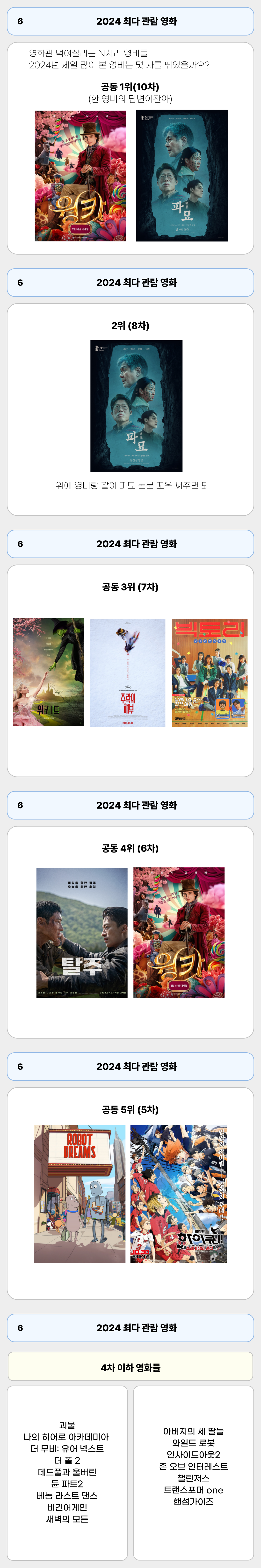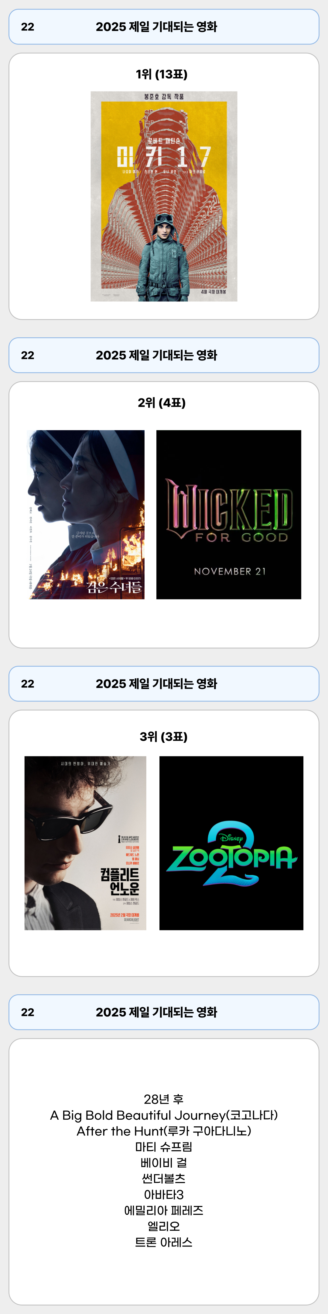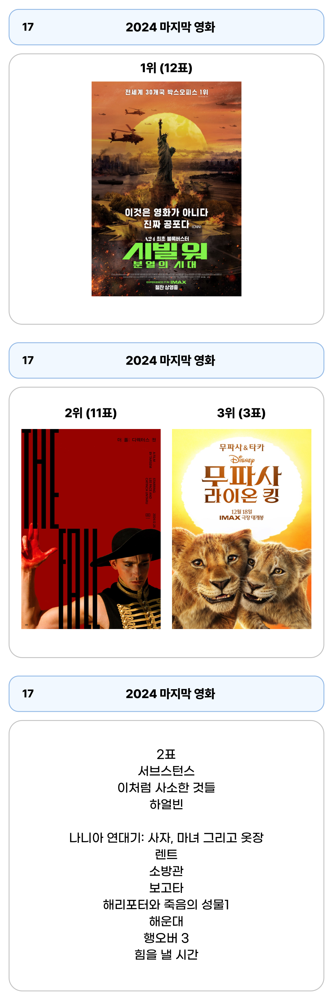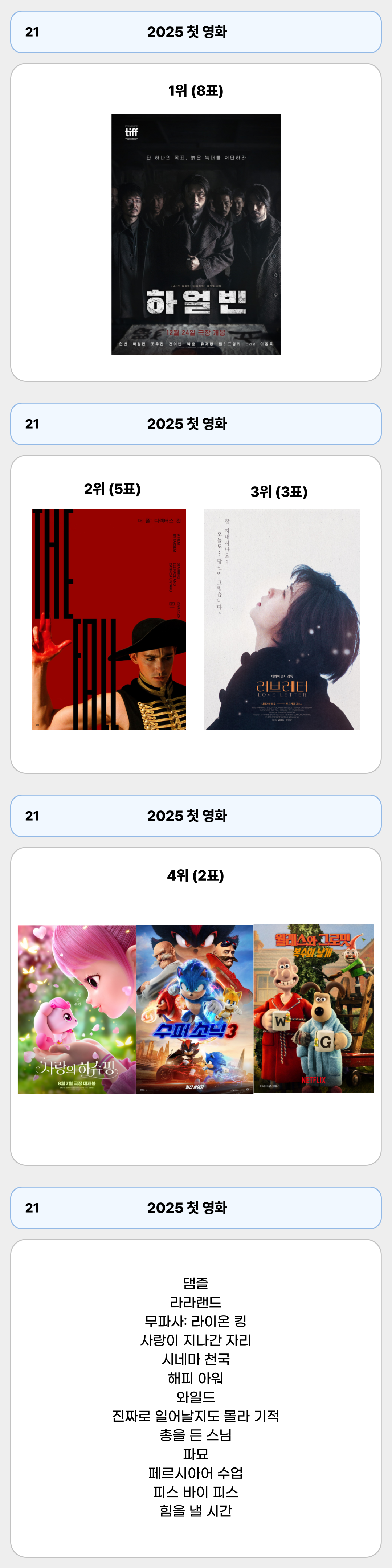 | 얘들아 우리 죽을때까지 평생 같이 영화 좋아하고 영화 함께 보는거야 올해는 원데이프패 미리미리 쓰걸아 항상 같이 영화 얘기해줘서 고맙잔아 2025년에도 잘 부탁합니다💙 영비들 없었으면 어디가서 영화 작품 얘기하고 또 몰랐던 영화들도 얘기하고...빡치는거 얘기하고 맛있는 매점 라이프를 이어갈 수 있었을지 상상이 안되잖아 다들 하는 프모마다 원활하게 성공하고 관크없고 즐거운 영화인생을 살았으면 좋겠다 새해 복 많이 받아🍀 올해는 영비들 모두 부디 모두 따뜻하고, 영화로운 나날들 보냈으면 좋겠잔아! 다들 새해 복 많이 받아🤎 다들 사랑해 올해도 좋은 영화와 함께해요 너무나 ㅈ 같은 세상에서 영화라는 공통된 한 가지를 같이 좋아하고 얘기할 수 있는 너희들이 좋아 행복하자 영타쿠똥꼬영비들아💩💕 영생살아 영비들이 영화 보기 좋은 세상 만들어줄게🥹🕯️ 같이 영화를 좋아하는 온라인 친구들이 있어서 너무 좋아. 앞으로도 함께하자. 영비들아 2025년도 건강하게 영화 많이 보자🍿 덕분에 영화 더 재밌게 보면서 행복했잔아 다들 올해도 즐거운 영덕질해보자고 2025년에도 하고픈 일 다 잘 되길 바라고!!! 앞으로도 영화 얘기 많이많이 하자 🎬🍀🦋💙 원래 그렇게 영화 보는거에 큰 관심이 있지는 않았는데 관심을 가지게 되고 취미로 삼으면서 영비들이랑 같이 얘기 나누니까 문득 영화를 취미로 삼은 내가 너무 좋아졌잔아. 영화를 사랑하게 되는데는 영비들의 힘도 진짜 크잔아! 비슷한 가치관을 가진 영비들과 영화 얘기 나누니까 영화를 조금 더 잘 느끼게 되고 영화 음악 등과 같은 다른 요소에도 눈이 뜨이고 귀가 트이는거 같아. 영비들 정말 고마워!! 영비들이맘놓고영화를사랑할수잇는세계가찾아오길🙏🏻 나에 영화친구 영비들아 🎬 올해도 달글 열심히 달려줘서 고맙잔아 난 사실 영달 달린지 1-2년정도밖에 안됐는데 너희 덕분에 영화를 더 많이 사랑하게 된거같아 똑같은 취미를 가진 누군가와 취미를 공유한다는게 얼마나 행복한 일인지 너희 덕분에 알게됐다잔아 25년에도 잘부탁해 사랑해 영비들 🍿❤️ 영비들아!!! 내가 요즘 바빠서 달글은 잘 못가지만...짬짬이 들르면서 넌에 뭐하나 한번씩 보고 간단다 그럴때마다 변함없이 영화 이야기로 가득가득한 달글 보면서 안심을 해 영화 얘기를 언제든지 할 수 있는 곳이 변함없이 항상 그곳에 있는 것 같아서 막 든든한거 먼지 아냐? ㅋ 여튼 그렇다고 😁 내가 영화 얘기 시작하면 숨 못쉬고 우다다다 말하는 오타쿠마냥 말하지만 이 달글에선 그런 놈이 나 혼자가 아니라는 사실에 정말 아무 엄청난 듬직함을 느끼고 있어 항상 고마워!!! 그니까 앞으로도 나랑 숨 못쉬고 우다다ㅏ 말하는 씹덕톡을 나랑 해줘야된다 알겟지 어디가지말고!!!! 노잼 영화 얘기도 너네랑 하면 좋단 말야!!!!!!! 왜 노잼이엇는지 말하면 그것또한 즐거움 그것 또한 컨텐츠야 ㅋㅋ 무튼 이 달글 1때부터 함께 해왓는데 어느덧 25년을 함께 맞이하는군아 25년엔 재밋는 영화가 더더 많았음 좋겠다! 그래서 영비들이랑 더더 많이 오래 떠들고싶어 항상 고맙고 사...사...사바하.💕 | 사랑해 25년에도 같이 영화보자 영비들 덕에 영화 취미로 계속 유지 가능한 것 같아 그리고 오래 살아서 노인정에서도 영달 달려 사랑해 평생 건강하게 영화 보자 - 영비들의 허리 건강을 기원하며 - 영비들 덕분에 재밌는 영화 많이 봤어 고마워!!!!!!!!! 2025년도 잘부탁하잔아~~~~ 영비들을 만날 수 있게 해준 바비에게 평생 감사해💗 영비들아 2025년에는 건강하고 행복하게 영친자의 삶을 살아보자! 그리고 영비픽은 무조건 믿고 보니까 올해도 많은 추천 부탁해,,🤭 연말결산 해준 총대영비도 너무 고마워🫶 영비들 모두 프모 성공길만 걷고, 시사회 다 당첨되고, 관크 없이 쾌적하게 영화 보고, 영비에게 꼭 맞는 영화를 찾을 수 있기를🍀🍀 영비들아 정말 다사다난한 2024년이었다... 영화 한 편 보는 것도 쉽지가 않아서 오히려 영화가 더 소중해지고 좋아지는 해이기도 했지만...! 다들 한해 고생 많았고 같이 달글 달려줘서 재밌었어 올해도 잘 부탁하고 영비들에게 새로운 인생영화가 찾아오는 해가 되길! 돼지들아 사랑한다 알지?? 결산 첨해보는데 넘 재밌다!!!! 총대 영비 너무 고맙고 다른 영비들 답변도 기대돼... 우리 오래오래 영화보면서 잼얘하자 ~~ 새해 복 많이 받고 감기 조심하길 . . . 영달을 만나고 돈 아끼면서 영화를 더 자주 볼 수 있게 됐어요,, 따알고💙 영화에 흥미를 가지게 해준 영비들 너무 고맙습니다💙 내년에도 사랑해~ 아직 영잘알은 아니라 나도 영비 눈아들처럼 영화에 진심 되고싶잔아 앞으로 더 열심히 달리겠잔아 다들 늘 건강하게! 밥 잘 챙겨먹으면서! 오래오래 함께 영화보자😁 똥찍먹 먼저 해주는 영비들이 있어서 좋다.. 2025년에도 일년의 반 이상을 영화관 의자에 앉아보자 평비해 🩷 영비들아 사랑해 너네가 있어서 내 영화생활이 더 풍족하고 재밌어 나랑 오래오래 영달 달리자 시대가 지나가도 영화 속에서 영원히 살아있을 영화배우들처럼 영비들아 앞으로도 달생살아줘 영비들아 사랑한다!~! 영비들 다사다난한 한해가 갔는데 