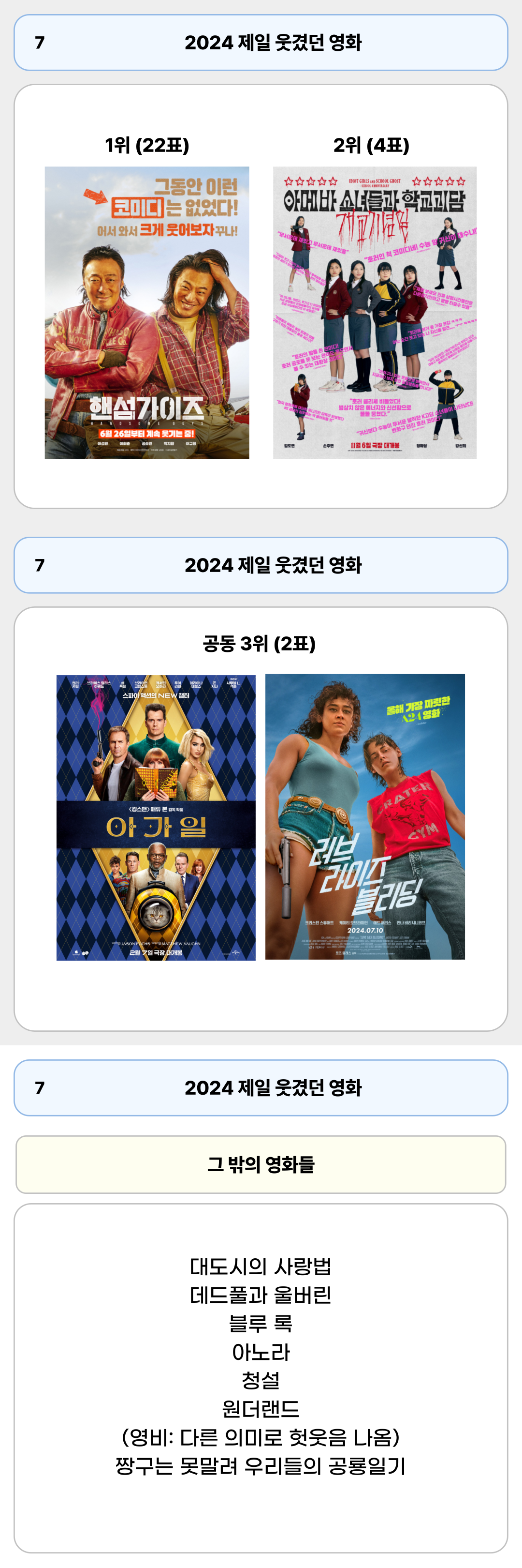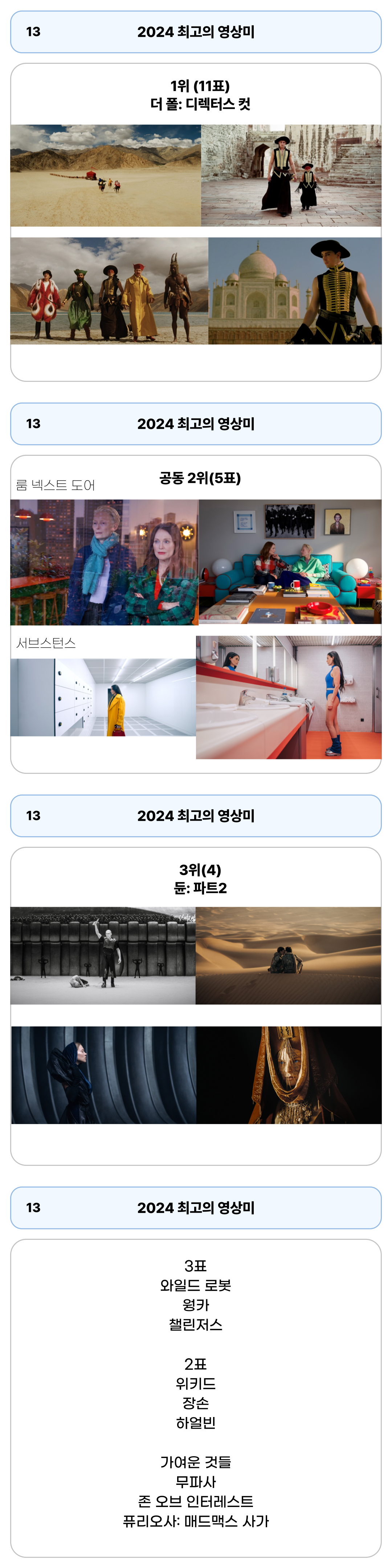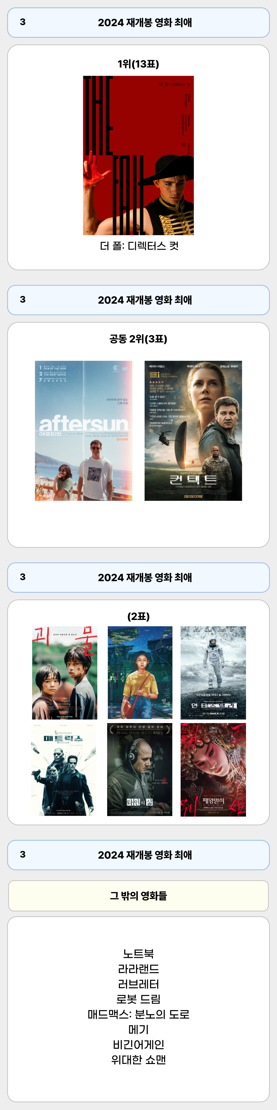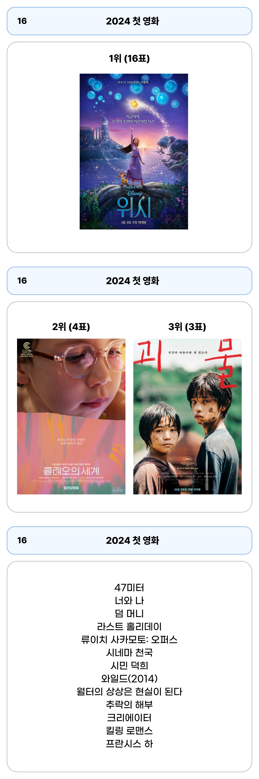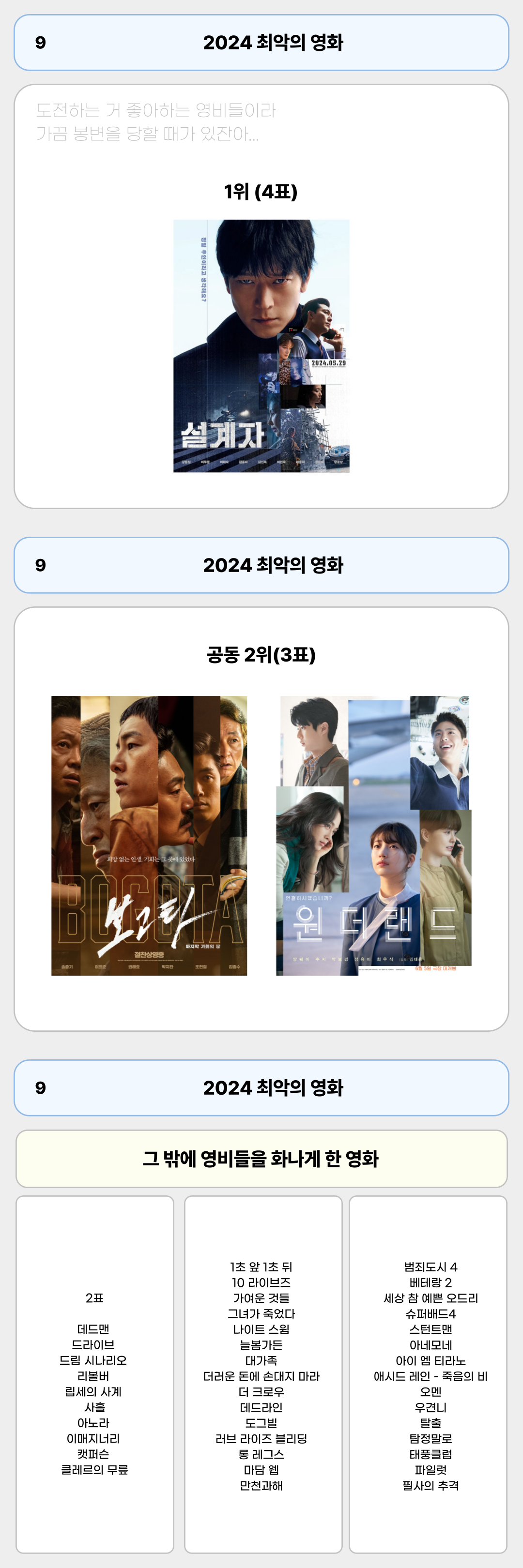 | 얘들아 우리 죽을때까지 평생 같이 영화 좋아하고 영화 함께 보는거야 올해는 원데이프패 미리미리 쓰걸아 항상 같이 영화 얘기해줘서 고맙잔아 2025년에도 잘 부탁합니다💙 영비들 없었으면 어디가서 영화 작품 얘기하고 또 몰랐던 영화들도 얘기하고...빡치는거 얘기하고 맛있는 매점 라이프를 이어갈 수 있었을지 상상이 안되잖아 다들 하는 프모마다 원활하게 성공하고 관크없고 즐거운 영화인생을 살았으면 좋겠다 새해 복 많이 받아🍀 올해는 영비들 모두 부디 모두 따뜻하고, 영화로운 나날들 보냈으면 좋겠잔아! 다들 새해 복 많이 받아🤎 다들 사랑해 올해도 좋은 영화와 함께해요 너무나 ㅈ 같은 세상에서 영화라는 공통된 한 가지를 같이 좋아하고 얘기할 수 있는 너희들이 좋아 행복하자 영타쿠똥꼬영비들아💩💕 영생살아 영비들이 영화 보기 좋은 세상 만들어줄게🥹🕯️ 같이 영화를 좋아하는 온라인 친구들이 있어서 너무 좋아. 앞으로도 함께하자. 영비들아 2025년도 건강하게 영화 많이 보자🍿 덕분에 영화 더 재밌게 보면서 행복했잔아 다들 올해도 즐거운 영덕질해보자고 2025년에도 하고픈 일 다 잘 되길 바라고!!! 앞으로도 영화 얘기 많이많이 하자 🎬🍀🦋💙 원래 그렇게 영화 보는거에 큰 관심이 있지는 않았는데 관심을 가지게 되고 취미로 삼으면서 영비들이랑 같이 얘기 나누니까 문득 영화를 취미로 삼은 내가 너무 좋아졌잔아. 영화를 사랑하게 되는데는 영비들의 힘도 진짜 크잔아! 비슷한 가치관을 가진 영비들과 영화 얘기 나누니까 영화를 조금 더 잘 느끼게 되고 영화 음악 등과 같은 다른 요소에도 눈이 뜨이고 귀가 트이는거 같아. 영비들 정말 고마워!! 영비들이맘놓고영화를사랑할수잇는세계가찾아오길🙏🏻 나에 영화친구 영비들아 🎬 올해도 달글 열심히 달려줘서 고맙잔아 난 사실 영달 달린지 1-2년정도밖에 안됐는데 너희 덕분에 영화를 더 많이 사랑하게 된거같아 똑같은 취미를 가진 누군가와 취미를 공유한다는게 얼마나 행복한 일인지 너희 덕분에 알게됐다잔아 25년에도 잘부탁해 사랑해 영비들 🍿❤️ 영비들아!!! 내가 요즘 바빠서 달글은 잘 못가지만...짬짬이 들르면서 넌에 뭐하나 한번씩 보고 간단다 그럴때마다 변함없이 영화 이야기로 가득가득한 달글 보면서 안심을 해 영화 얘기를 언제든지 할 수 있는 곳이 변함없이 항상 그곳에 있는 것 같아서 막 든든한거 먼지 아냐? ㅋ 여튼 그렇다고 😁 내가 영화 얘기 시작하면 숨 못쉬고 우다다다 말하는 오타쿠마냥 말하지만 이 달글에선 그런 놈이 나 혼자가 아니라는 사실에 정말 아무 엄청난 듬직함을 느끼고 있어 항상 고마워!!! 그니까 앞으로도 나랑 숨 못쉬고 우다다ㅏ 말하는 씹덕톡을 나랑 해줘야된다 알겟지 어디가지말고!!!! 노잼 영화 얘기도 너네랑 하면 좋단 말야!!!!!!! 왜 노잼이엇는지 말하면 그것또한 즐거움 그것 또한 컨텐츠야 ㅋㅋ 무튼 이 달글 1때부터 함께 해왓는데 어느덧 25년을 함께 맞이하는군아 25년엔 재밋는 영화가 더더 많았음 좋겠다! 그래서 영비들이랑 더더 많이 오래 떠들고싶어 항상 고맙고 사...사...사바하.💕 | 사랑해 25년에도 같이 영화보자 영비들 덕에 영화 취미로 계속 유지 가능한 것 같아 그리고 오래 살아서 노인정에서도 영달 달려 사랑해 평생 건강하게 영화 보자 - 영비들의 허리 건강을 기원하며 - 영비들 덕분에 재밌는 영화 많이 봤어 고마워!!!!!!!!! 2025년도 잘부탁하잔아~~~~ 영비들을 만날 수 있게 해준 바비에게 평생 감사해💗 영비들아 2025년에는 건강하고 행복하게 영친자의 삶을 살아보자! 그리고 영비픽은 무조건 믿고 보니까 올해도 많은 추천 부탁해,,🤭 연말결산 해준 총대영비도 너무 고마워🫶 영비들 모두 프모 성공길만 걷고, 시사회 다 당첨되고, 관크 없이 쾌적하게 영화 보고, 영비에게 꼭 맞는 영화를 찾을 수 있기를🍀🍀 영비들아 정말 다사다난한 2024년이었다... 영화 한 편 보는 것도 쉽지가 않아서 오히려 영화가 더 소중해지고 좋아지는 해이기도 했지만...! 다들 한해 고생 많았고 같이 달글 달려줘서 재밌었어 올해도 잘 부탁하고 영비들에게 새로운 인생영화가 찾아오는 해가 되길! 돼지들아 사랑한다 알지?? 결산 첨해보는데 넘 재밌다!!!! 총대 영비 너무 고맙고 다른 영비들 답변도 기대돼... 우리 오래오래 영화보면서 잼얘하자 ~~ 새해 복 많이 받고 감기 조심하길 . . . 영달을 만나고 돈 아끼면서 영화를 더 자주 볼 수 있게 됐어요,, 따알고💙 영화에 흥미를 가지게 해준 영비들 너무 고맙습니다💙 내년에도 사랑해~ 아직 영잘알은 아니라 나도 영비 눈아들처럼 영화에 진심 되고싶잔아 앞으로 더 열심히 달리겠잔아 다들 늘 건강하게! 밥 잘 챙겨먹으면서! 오래오래 함께 영화보자😁 똥찍먹 먼저 해주는 영비들이 있어서 좋다.. 2025년에도 일년의 반 이상을 영화관 의자에 앉아보자 평비해 🩷 영비들아 사랑해 너네가 있어서 내 영화생활이 더 풍족하고 재밌어 나랑 오래오래 영달 달리자 시대가 지나가도 영화 속에서 영원히 살아있을 영화배우들처럼 영비들아 앞으로도 달생살아줘 영비들아 사랑한다!~! 영비들 다사다난한 한해가 갔는데 