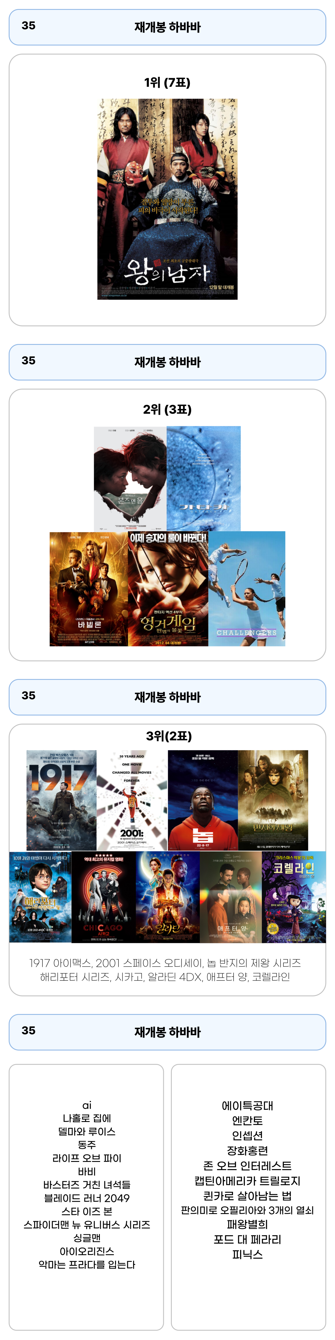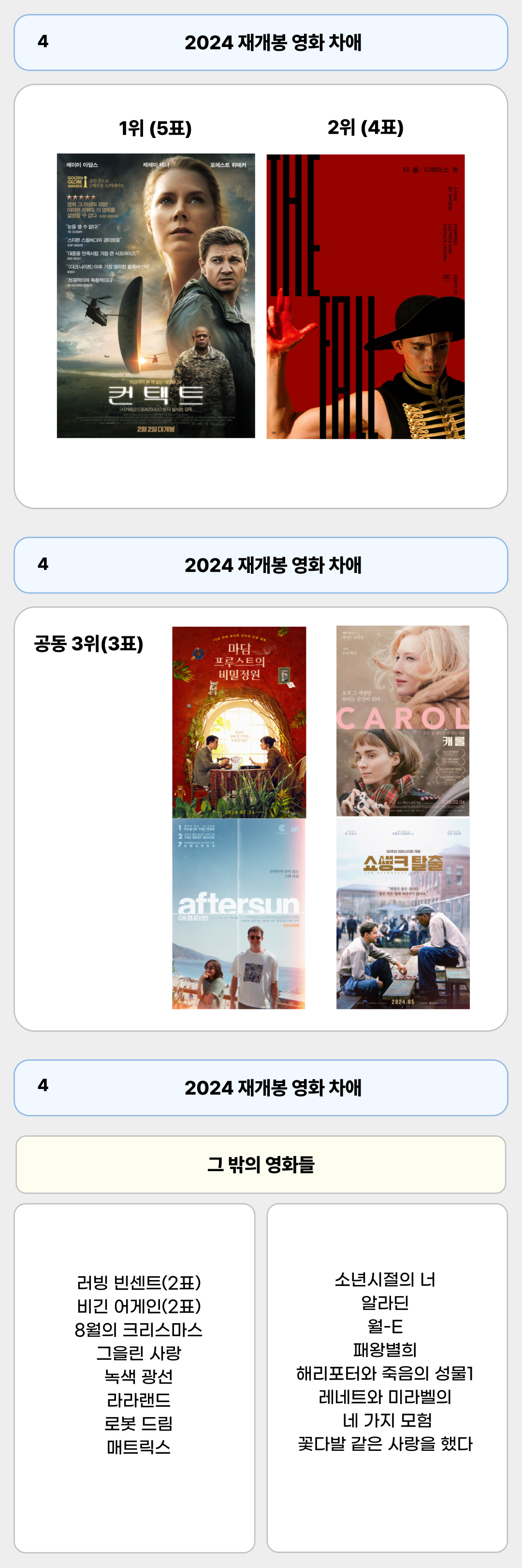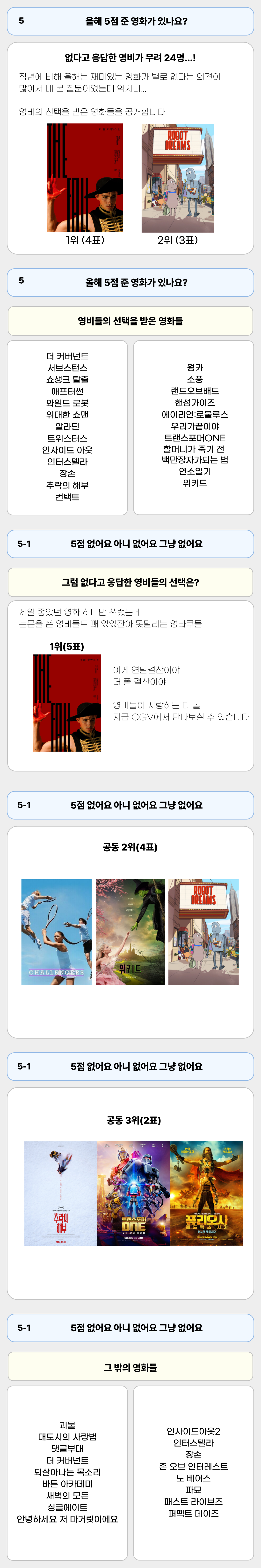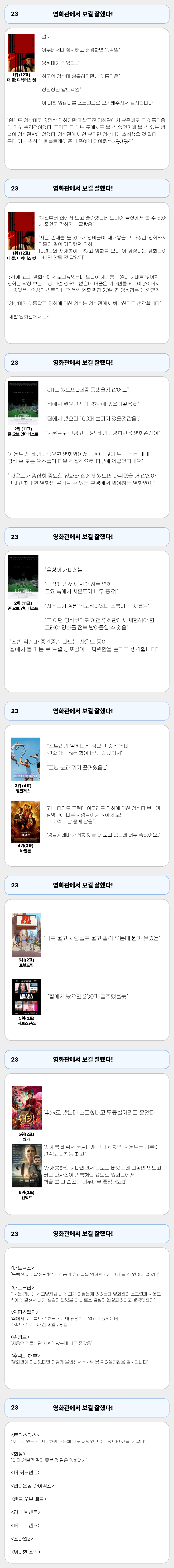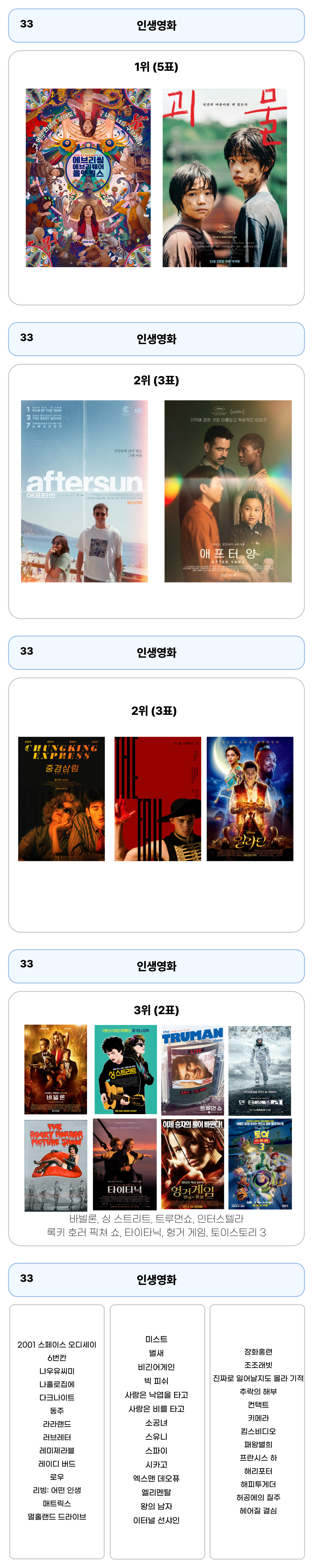 | 특별한 날 그냥 다같이 단관하는거! 한번씩 하지만 계속해서 하고 싶어서 (〃⌒▽⌒〃)ゝ 영비들이랑 용아맥 대관하기 ㅋ 물론 안 되죠.. 그럼 그냥 온라인 단관이라도... 단체로 똥 찍먹하기(똥단관) 뭐 있지..근양 다같이 단관이나 크게 한번 하면 좋겟잔아요 몇명이서 말고 진짜 거의 모든 영비가 같이 보면 좋겟어 배달 음식 정해서 어울리는 영화 같이 보고 싶어요 (예: 인사이드아웃 - 피자) 음...... 설문조사가 너무 재밌어요 다양한 설문조사! 하루에 영화 명대사 하나씩 정하고 필사하기^^..? (급하게 생각해봄) 몰루겟어요 (이미 1월이 며칠 지났지만) 2025년 새해 기념 1일 1 고전 영화 뿌수기 👊🏻💥, 포스터 일부 보고 영화 맞히기 옛날에 포스터 크롭해서 영화 맞추기 하던거 개꿀잼이엇는데 하 불가능할 것 같지만 방금 생각해낸 건데 각자 어떤 영화인지는 비밀로 해서 영화 하나씩 예매하고 서로 예매번호만 알려준 채로 바꿔서 영화 보기 온라인단관(이미 있나..?) 영화퀴즈 한번 하자 영화에 나온 음식 다 같이 준비해서(금손의 레시피가 필요함) 같이 먹으면서 영화보기 지금처럼 여름에 하는 공포영화 단관이나 크리스마스 영화 단관도 쭉 했으면 좋겠고! 제가 할로윈을 좋아해서 할로윈에도 호러 영화나 할로윈 관련 영화 단관도 하고 십어요 ₍ᐢɞ̴̶̷.̮ɞ̴̶̷ᐢ₎ 무비올나잇 창의력이 딸린다 릴레이 대본 쓰기?ㅋㅋㅋㅋㅋ 영비들만의 MD를 제작하고 싶잔아! 키링이나 티켓 홀더 같은거...! 너무 부담스럽지않은데 영화 보러 다닐 때 잘 쓸 수 있을만한걸로 (〃⌒▽⌒〃)ゝ | 영비들이 뽑은 최악의 영화 단체관람하기 연말 결산! 한 달에 한 시리즈씩 정해서 단관하기(〃⌒▽⌒〃)ゝ 단관. 오프라인에서. (ㅈㅅ합니다 그치만 바랄 수는 있잔아요) 캐치프레이즈 만들어보기 뭐가 있을까?.. 영비들이 제안하는 콘텐츠 열심히 참여할게 매주 혹은 한 달에 한 번 영화 지정해서 이야기하기 ㅋ 근데 말하고 보니까 영달에서 맨날 하는 게 이거긴함 없음 영달 굿즈 만들기 ㅎ 언젠가... 그 언젠가.... 용아맥을 대관해서 그 큰 스크린으로 아맥 단체 관람하기... 관크없고 냄새안나고 너무너무 좋을 듯..(근기야..!!!!) 허락만 받을 수 있다면 진짜로 단관해보고 싶음. . 영화관 단관 저번에 나온 영화 시나리오 맞추기 재밌어 보이던머ㅋ 단관🥺 설문 하고 싶었는데 딱이에요 ^-^ 영비들의 인생영화 단관 영화 노래 듣고 / 명대사 보고 영화 제목 맞히기 재밋겟덩 영화 테마나 장르 하나 잡고 리스트 뽑아서 단관하기(예: 곧 할 예정인 고전영화 뿌수기) 영화제목 보고 시놉 추측하는 컨텐츠! 달글에 올라왓엇능데 진짜 재밋을 것 같아요 글구 고전영화 뿌수기 챌린지도 꼭...!!!!!🥰 영비들이랑 하는거라면 뭐든 좋아 |