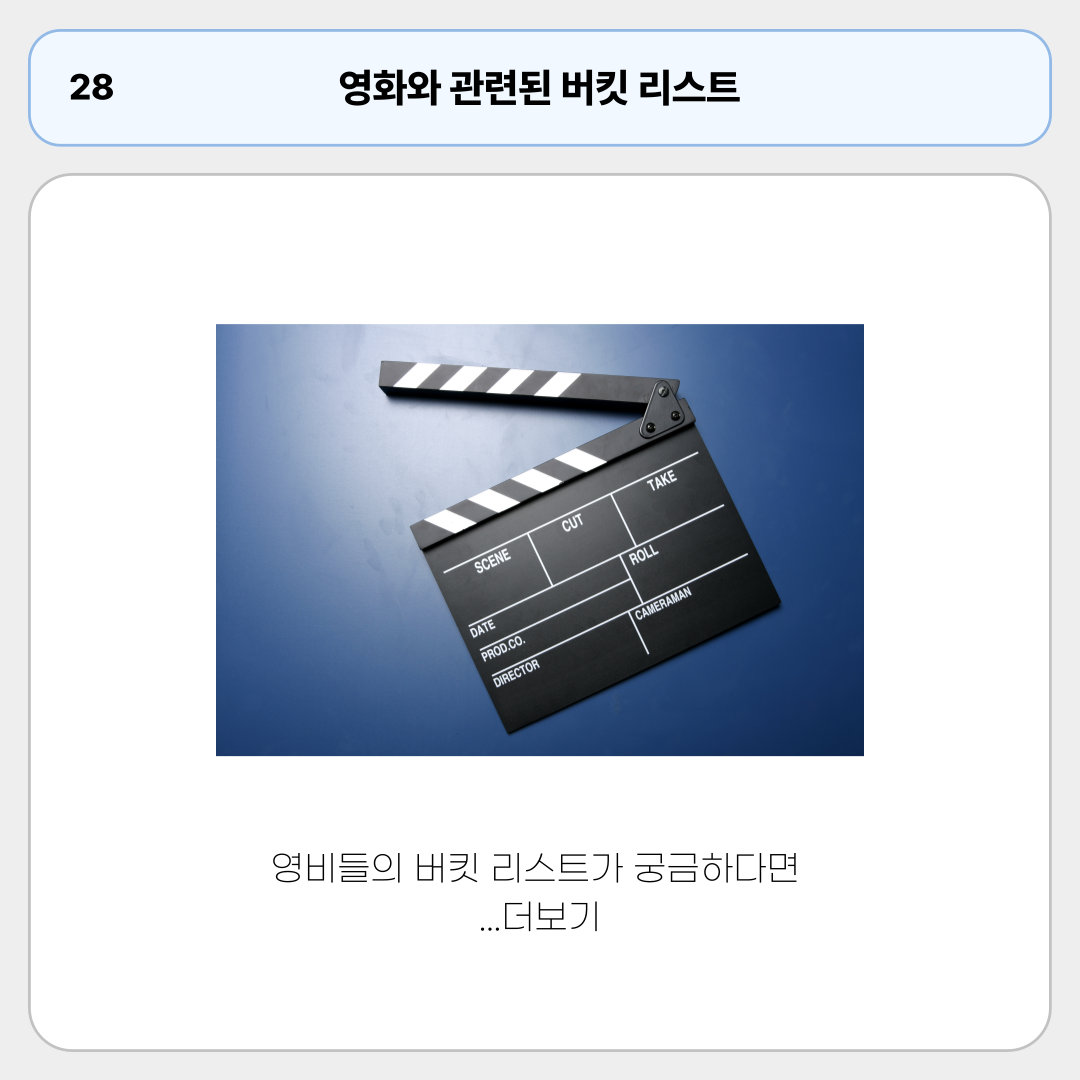| 죽기전까지 10000편 보기! 해리포터 촬영지 가보고싶잔아.. 오리지널티켓 만들어보고싶잔아 전국 영화제 전부 도장 깨기!! 올해는 무슨 일이 있어도 전주국제영화제에 가보는 게 목표잔아요 살아있는 동안 한번은 다 가겠지 제발 촬영지 가보기 커뮤니티에 돌아다니는 명작 모음 글? 목록에 있는 영화들 다 보기 심야 영화를 본 적이 한번도 없어서 차를 멋지게 운전해서 보고오기... 무사히 귀가하기... 영화관에서 자정부터 영화 연달아 보고 첫차 타고 집가기🌄 / 부국제가서 한 일주일동안 하루종일 영화만 보고 오고싶어유.. 갈때마다 짧게 머물러서 아쉬운🥹 전주, 부산토비들 넘 부럽잔아!!!!!!! 3대 영화제 가보기! 사실 칸은 가봐서 베를린이랑 베니스 가보는 게 소소한 목표 용산 CGV처럼 엄청난 시설의 영달 영비 전용 영화관을 만들어 영비들은 무료로 관람할 수 있게 하기, 정승제 생선님처럼 집에 개큰 나만의 영화관을 만들기 야외에서 캠프파이어 하면서 보기 그냥 좋아하는 영화 촬영지에 가보기... 최애 영화 촬영지 전부 가보기, 감독님 만나기 1. 왕의남자 영화관에서 보기 (제발) 2.해외영화제 가보기 3.영화관에서 영화보면서 밤새기 or 완전 심야영화보기" 돈 많이 벌어서 혼영족들을 위한 영화관 만들고 싶어요. 폰은 영화보기 전에 제출하고 들어가야됨 내가 24시간 감시하면서 떠드는새퀴는 강퇴시킴 해외 큰 영화제부터 우리나라 작은 소소한 영화제까지 닥치는대로 다 가보기! 그리고 유럽이나 미국에 나라나 주 하나씩 잡고 극장 싹 투어하기! 우리나라는 극장들이 되게 획일화 되어있고 수도권에 집중되어 있는데 옛날부터 영화를 상영해 온 서양권은 영화관도 오래되고 영화관마다 느낌도 다를 것 같아 궁금합니덩 그리고 영화에 나온 동네로 여행 가서 겸사겸사 영화에 나온 장소들 투어 하기 (+배우랑 같은 포즈로 사진 갈기기) 그리고 좀 큰 버킷인데 나중에 독립예술영화관 차리는 게 꿈이잔아 ㅋ 영비라고 말하면 포스터 숨겨놨던 거 더 줄래 케케케 죽기 전에 10000편 보는게 버킷리스트잔아 이제 1030편 정도 됐는데 할머니 돼서도 보러 다니면 삽가 오래가자 영화야... 한 해에 나오는/수입되는 영화 다 봐보기ㅋㅋㅋㅋ 홈시어터 설치!!!! 알라딘 OST 중에 Friend Like Me, Prince Ali 노래방에서 어버버하지않고 한 번에 부르기 ( ◠‿◠ ) | 전국의 모든 독립영화관 도장깨기, 고전영화 뿌수기, 집에서 영화볼 때 되도록 배속 안 하기 지방 영빈데 원프패 받을수있게되면 날잡고 올라가서 용산 씨지비 원프패 + 특별관 다 즐기고 오는게 내 버킷이잔아 내가 아직 못본 지난 영화들을 다 영화관에서 볼 수 있게 되는 것..OTT로는 영화를 온전히 다 전달받지 못하는 입장인지라(개인적으로) 첫눈은 전부 영화관에서 하고싶어요! 존버하면.언젠가는.영화관에서.본다.이루고잇다.😍 영화 촬영지 여행가기(사운드 트랙 들으면서 돌아다니기) 해리포터 스튜디오 가기 cgv svip 달기!!! 그리고....용아맥..용포디 명당 가보기........ .... .. 패딩턴 여행지 따라가보기 좀 더 정확히 말하면 패딩턴2가 최애라 런던에 꼭 가보고 싶잔아 겨울에.... 빨간 모자.. 파란 코트 입고... 여행하는 성인 여성이 있다면 그게 나일지도... 좋아하는 영화에 나오는 장소 찾아다니면서 여행하기! 그리고 해외 가서 모르는 언어 영화를 자막 없이 보면 어떤 느낌일지 경험해보고 싶잔아 해리포터 마블 반제 스워 이런 프차 영화들 무비 올나잇... 잠깐의 텀만 두고 영화관에서 내내 보고파 그리고 해외 영화제들 가보는 거 마이 홈 시네마 만들기 ㅎ 영비들 덥카들고 놀러오라잔아~~ 국외 영화제 가보기, 좋아하는 영화 촬영 장소 따라가보기 저는 영달대표 쫄보입니다... 유명한 공포영화들 도장깨기 하고 싶어요 근데 너무 무섭잔아 CGV SVIP 달기, 영화관에서 1년에150편 보기, 영화관에 주말공휴일제외 매일 출석하기, 홈시네마 장비 갖추기, 헐리웃 영화 엑스트라 출연하기 근데 얼굴이 0.1초라도 나와야 함, 삶의 마지막에 최애 영화 틀어두기 유명한데 못본 모든 영화 시리즈물 정주행 하기!, 씨지비 svip 달성하기 ㅎ 영화관에서 밤새보기 밤 12시부터 아침 해 뜰 때까지 영화관에서 영화 보기 언젠가 정말정말사랑하게되는 영화를 만나고 싶어요 그 영화를 사랑하는 것이 곧 나를 설명하는 것인 영화.. 엔딩 크레딧에 이름 남기기 - 근데 벌써 성공했잔아 희희 하루에 3개까지 본 적 있는데 5개 뿌수고 싶어요 좋아하는 영화 해외 촬영지 가보기, 죽기 전에 1만편 보기 |