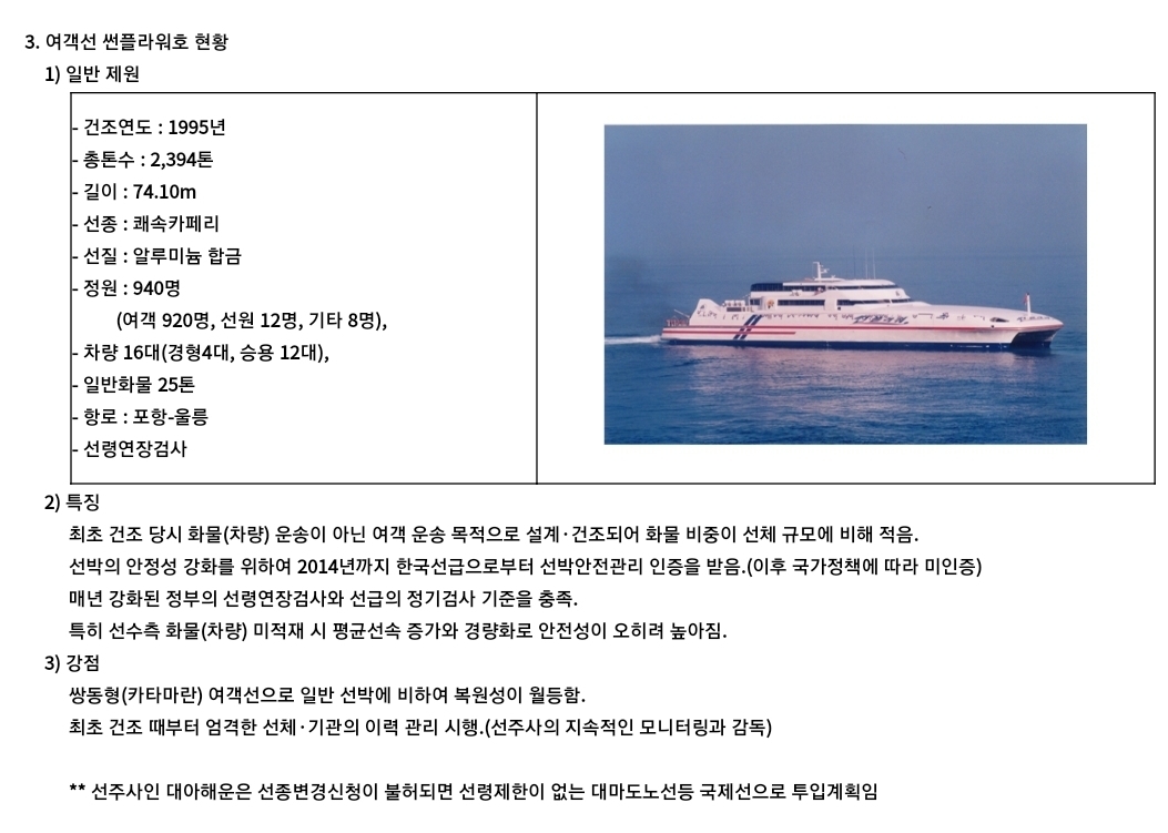 그래서 여객전용은 선령30년, 화물겸용 여객선(썬플라워호)은 선령25년이라는 법규정에 대해, 현재의 썬플라워호의 구조변경(화물칸 폐쇄)을 통해, 여객전용 여객선으로 선종을 변경하여 25년에서 30년으로 선령을 늘려