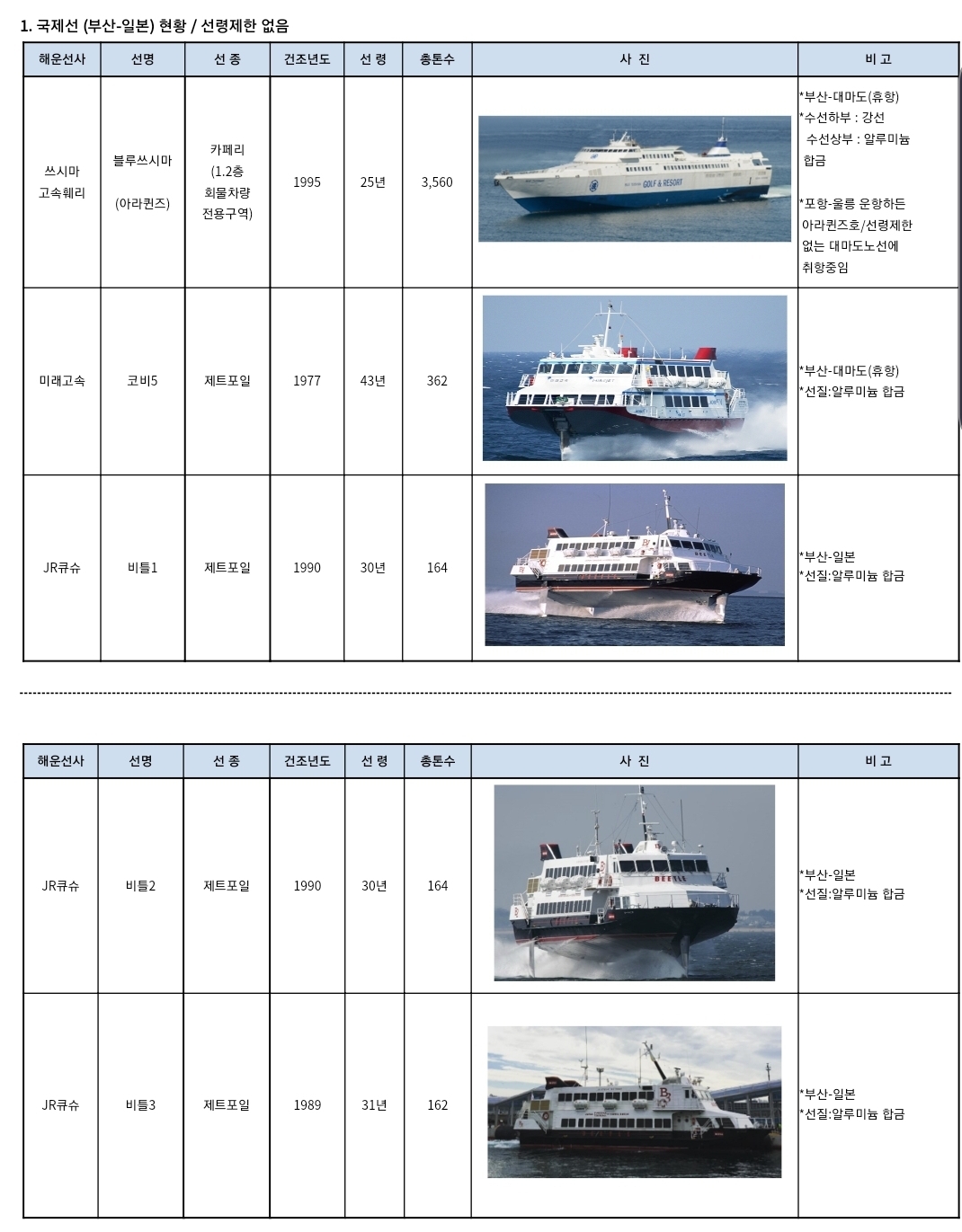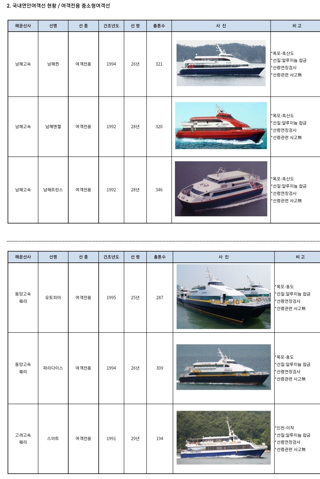 참고로, 전세계 해운시장에서 선령을 화물겸용 여객선은 25년, 여객전용 여객선은 30년으로 제한하고 있는 나라는 대한민국 뿐이라는것을 알려드립니다.