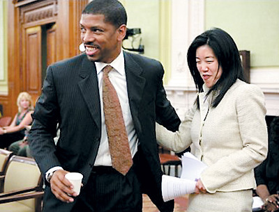 - ▲ 2007년 미셸 리 워싱턴DC 교육감의 인준청문회 때 증인으로 출석한 케빈 존슨(왼쪽) 새크라멘토 시장과 리 교육감.