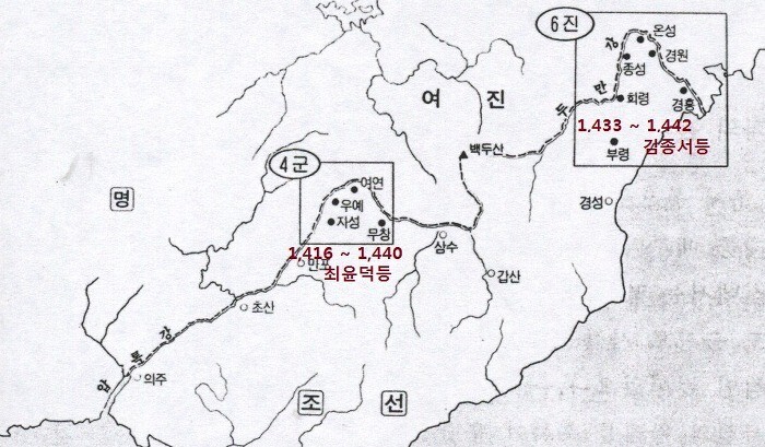 를 찾으니 조선초에 평북 삼분지 2와 함경남도 상당부분에 이르렀는데 세종때 최윤덕과 김종서가