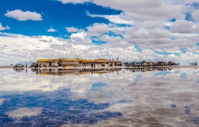 우유니 소금 사막이 유명한 이유는 우기에 빗물이 하늘을 비춰 마치 거울을 마주보고