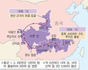 홍군은 국민당군의 포위와 추격을 뚫고 탈출해 대장정에 오르니 2년간 18개 산맥을 넘고