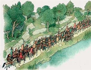 짐작하고는 숙영한후 기원전 217년 4월 19일 아침에 호수 북쪽 산 아래의 저 좁은 길로 행군해 옵니다.