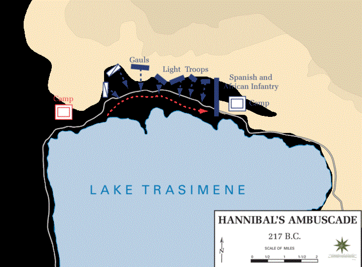 한니발은 트라시메노호수 북쪽에 병력을 매복 시키고 추격해온 플라미니우스군 이 호반의 좁은 길을 지나고