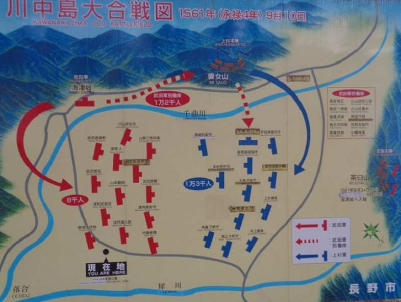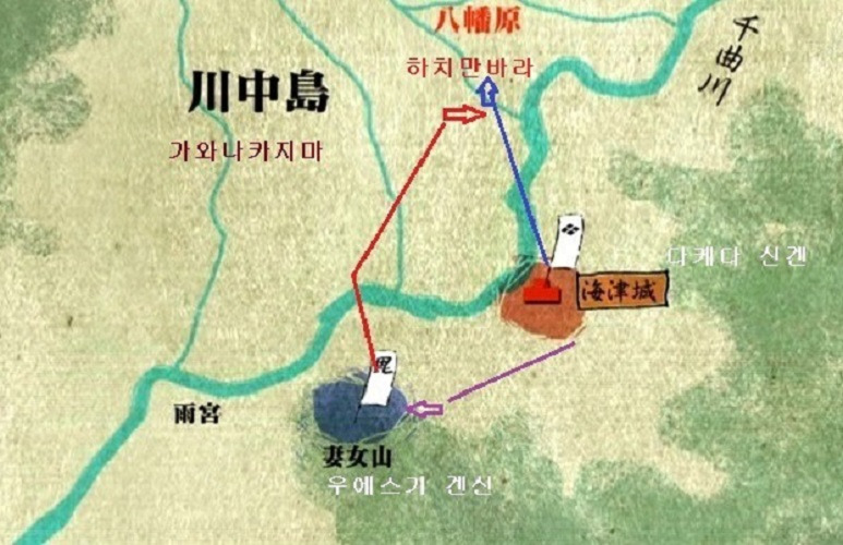 지쿠마강 (千曲川) 을 건너 가와 나카지마 에 진을 치고 별동대 1만 2천은 비밀리에 사이조산 으로 올려 보냅니다.