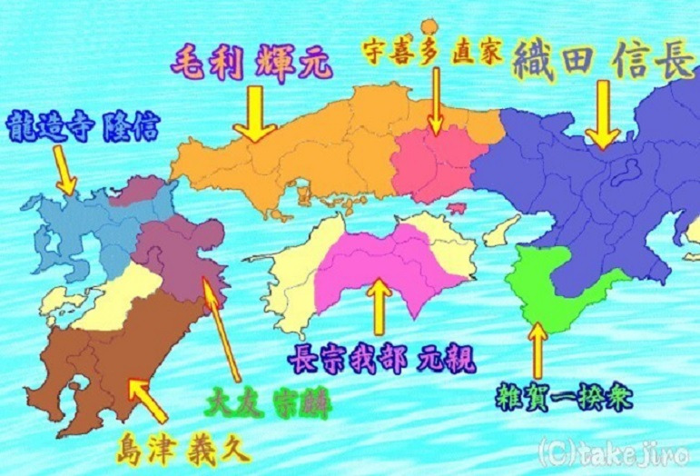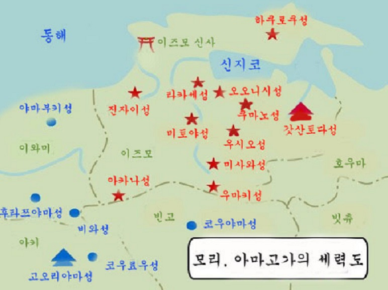 (山陰: 시마네)의 아마코군과 전투를 벌여 3년만에 항복을 받으니 나이 70세에 서국을 통일하게 되었습니다.