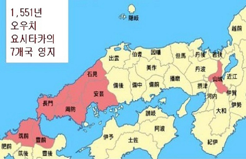 역시 야마구치의 영주인 백제 성왕의 후손 오우치 (大內) 씨에게 축출되어 도망치는 신세로 전락합니다.