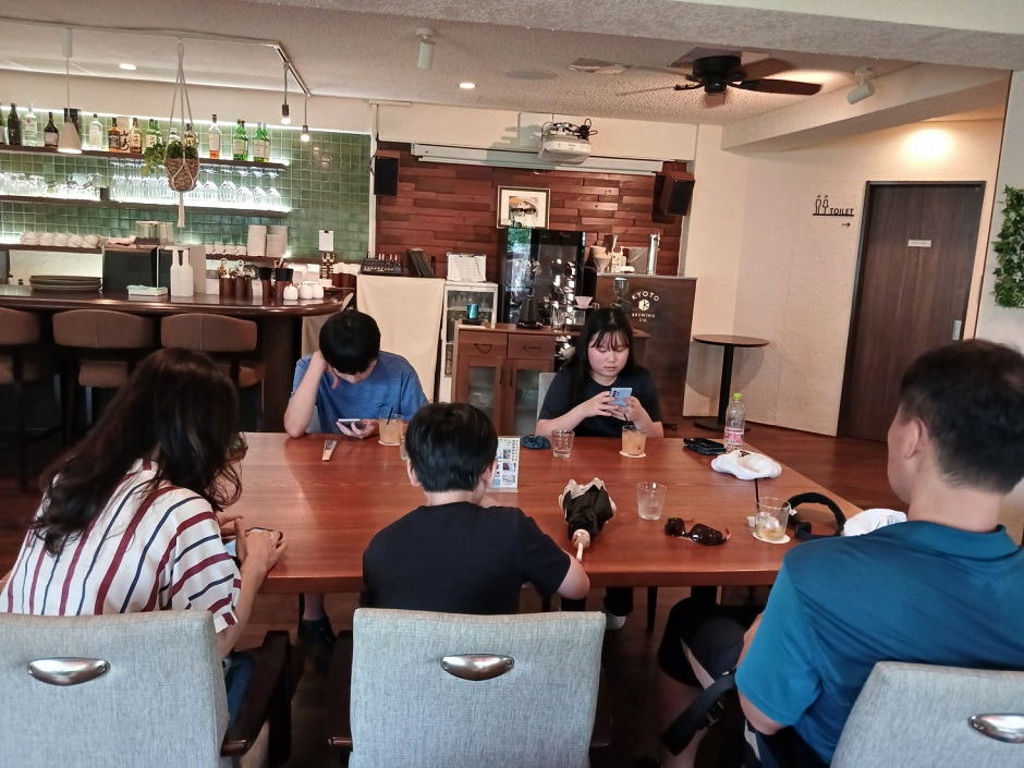 우리 일행중 한명의 다리가 통로쪽 으로 나와있으니 여주인이 지나가다가 "다리를 넣으라" 고 말하는데