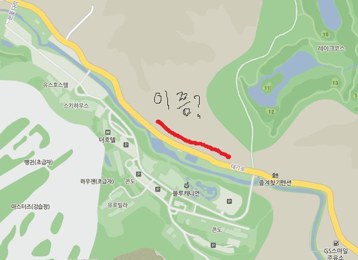 그래서 점심에만 한 2시간은 까먹고 1시간 늦게 숲체험을 했다. 지도에서는 명칭이 쓰여있지 않다. 도로(태기로)에서 레이크코스 쪽에 있다. 혼자 등산하는 것도 괜찮지만 가이드가 붙으면 더 좋다. 호텔(휘닉스파크)에서 문의할 수 있다.