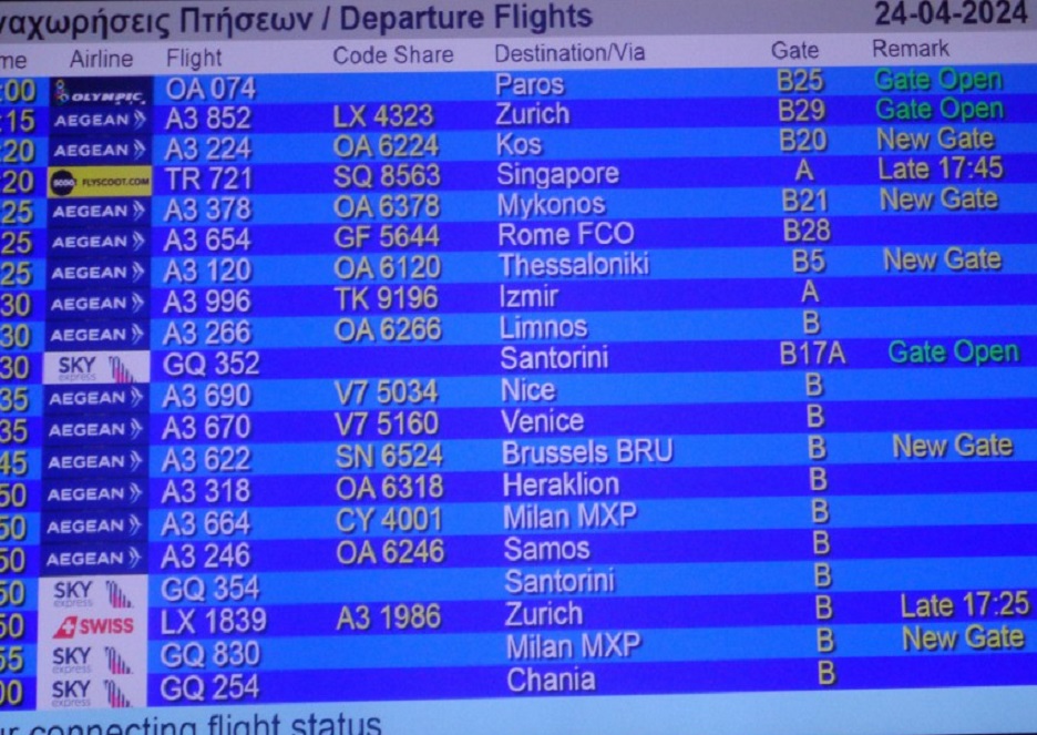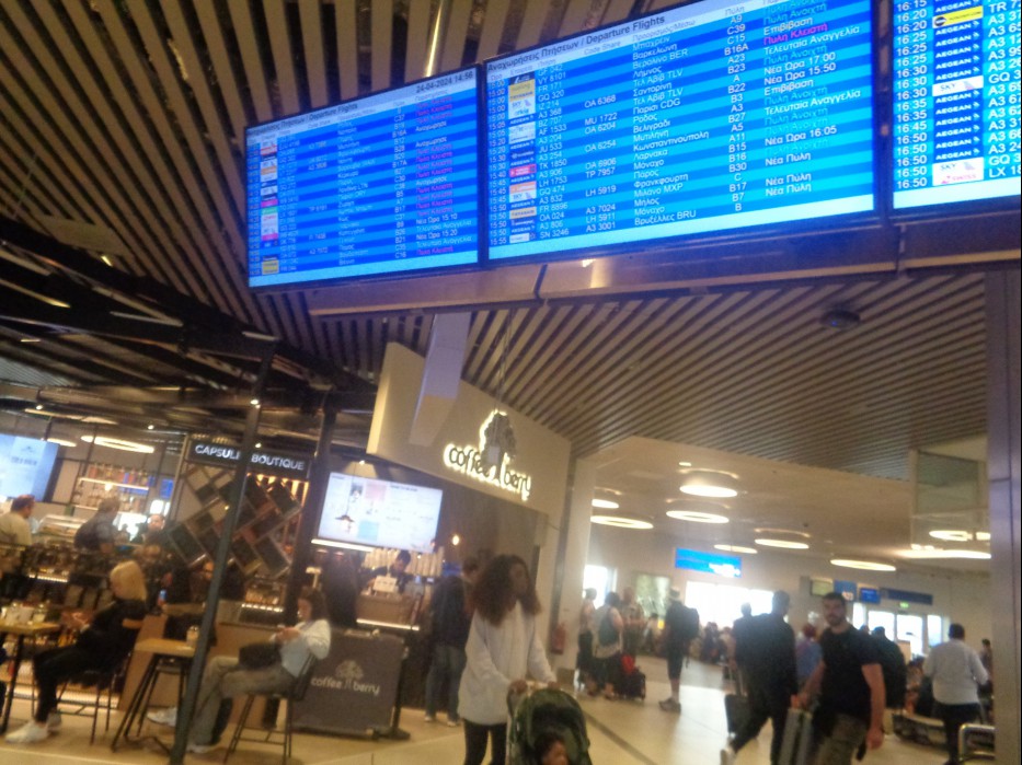 이고.... 전광판에서 미코노스 Mykonos 행 에게안 항공 16시 25분 A 3378 확인한다고 적었습니다.
