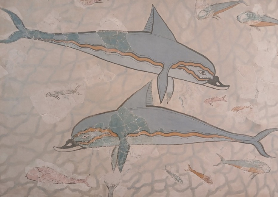크노소스궁 왕의 침실 벽돌에 새겨진 양날 도끼와 왕비의 침실에 돌고래 프레스코화