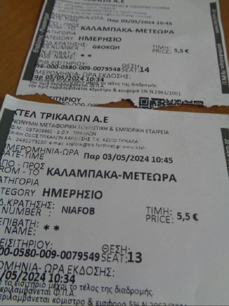 KTEL(ΚΤΕΛ) BUS 정류소에서 10시 45분에 출발하는 메테오라 Meteora 행 버스를 탑니다.