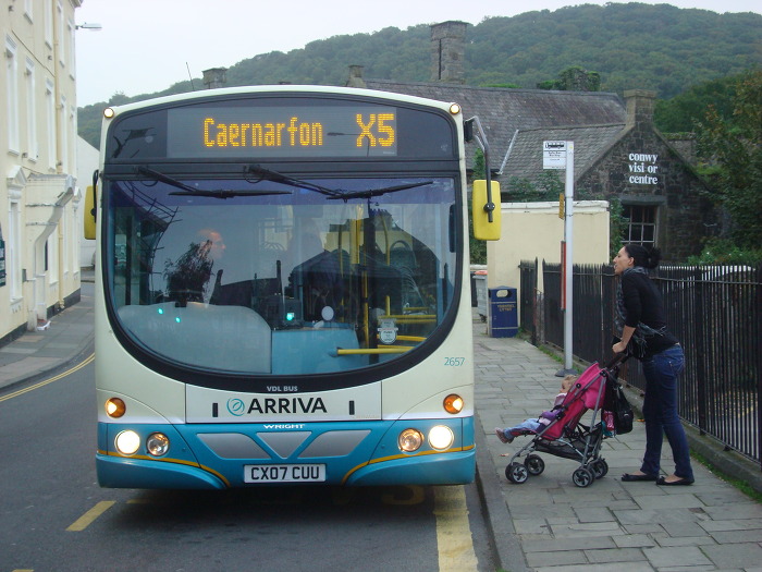 버스 정면 위 전광판 에 카나번“Caernarfon X5" 이라고 쓰여 있기로 잠깐동안