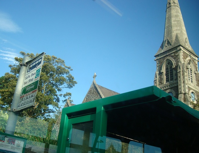투박한 돌로 벽을 붙인 교회 를 지나 버스 정류소는..... 듣던대로 “Bus Stop"