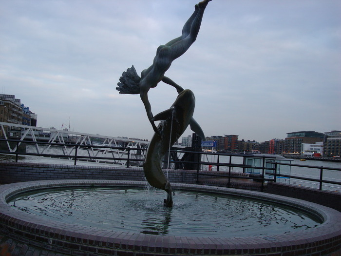 분수 한가운데에 날렵한 돌고래와 소녀인지 아니면 인어(?) 인지가 어울린 조각상