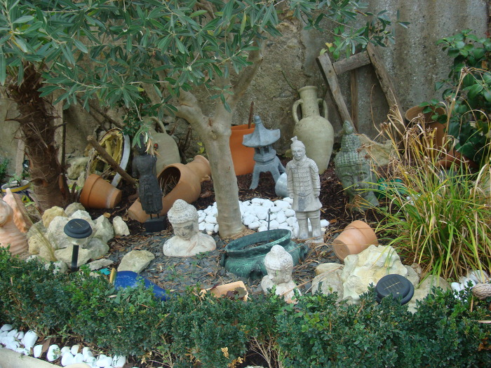다리 를 건너 기차역 을 찾아 가는데 어느집 정원에 진시황릉에서 발굴된 병사 모형