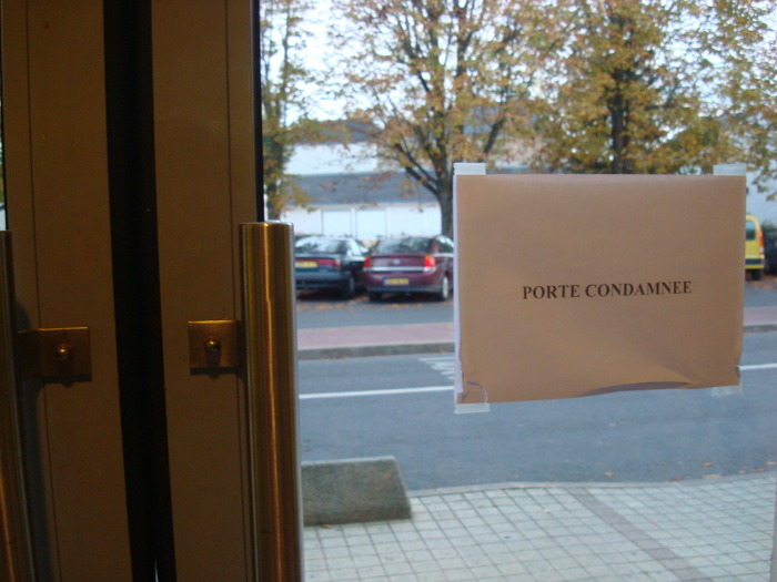 유리 문에 Porte Condamnee 라는 종이가 붙어 있어 자라보고 놀란 가슴 솥뚜껑