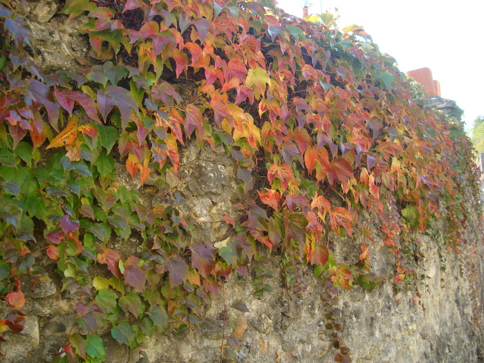 방향으로 걸어서 붉은 담쟁이 꽃 이 예쁘게 핀 집을 지납니다.