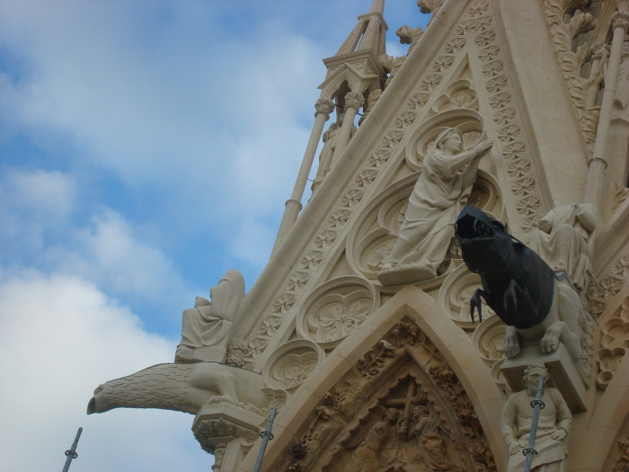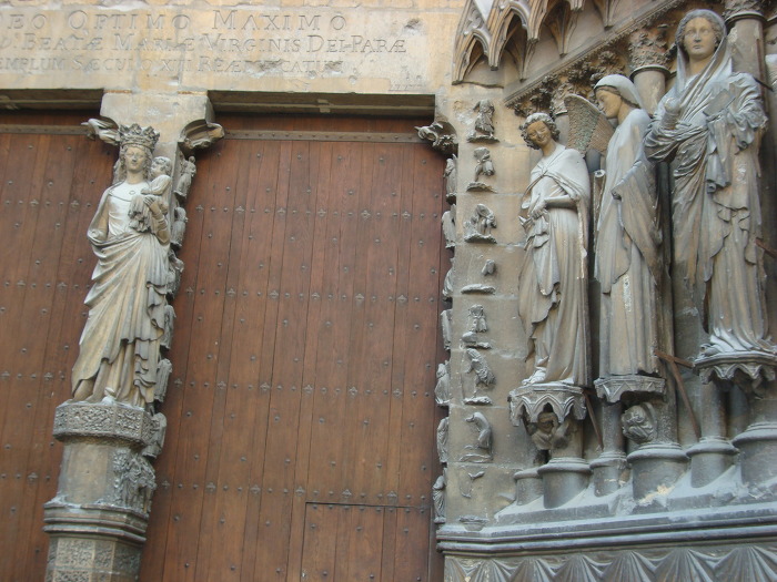 2,300개의 조각상 으로 장식된 전면 파사드 중에서도 왼쪽 포르타유 ( 출입구 ) 의