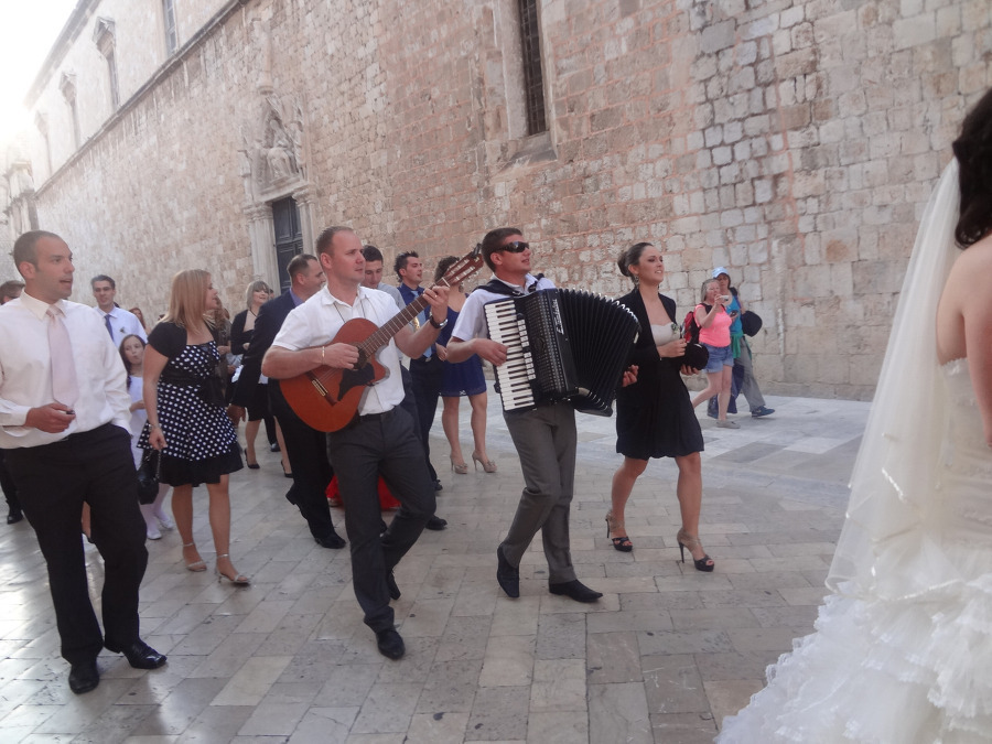 신랑신부 뒤로는 기타와 아코디언을 연주하는 악사들 에 이어 50여명이 넘는