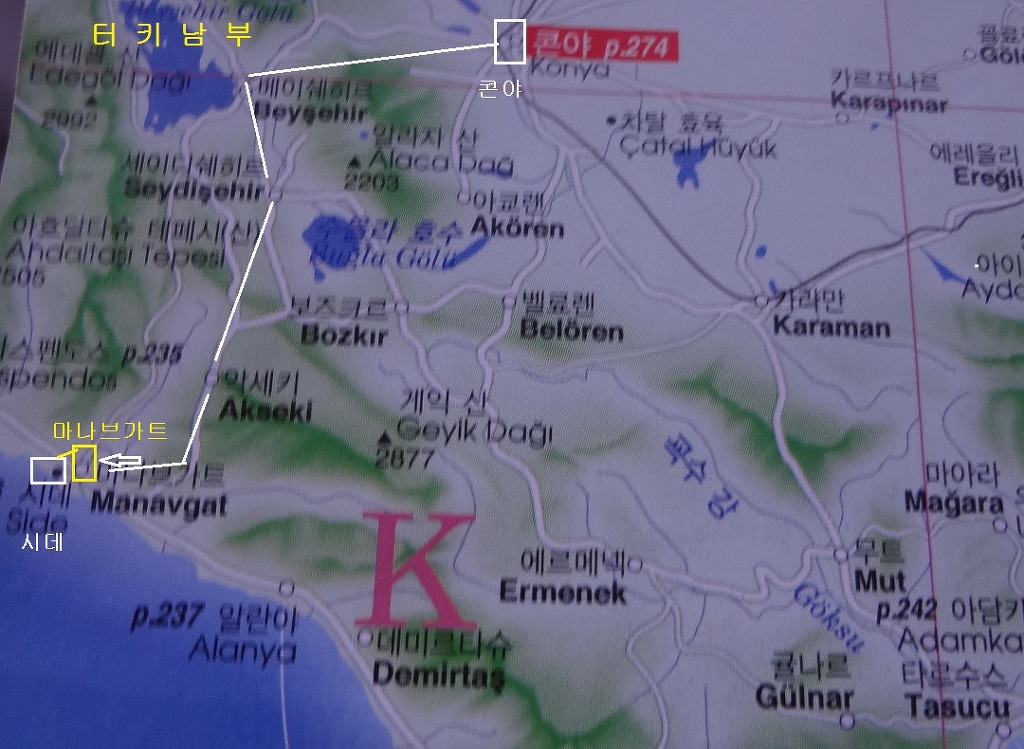 엄청 큰 호수 이고 주변 도시는 베이쉐히르 Beysehir 인데 왼쪽으로 꺽어져 남쪽으로