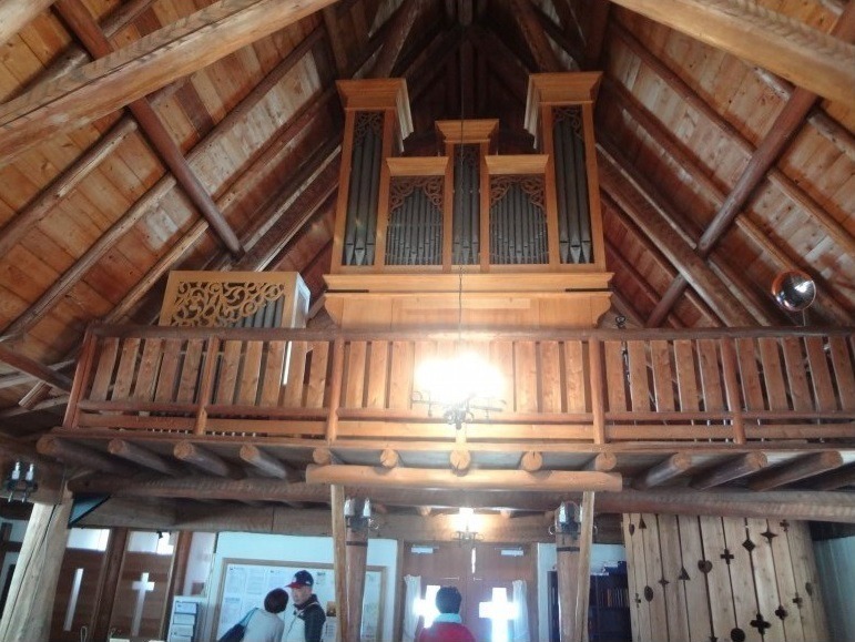 문 위에 파이프 오르간 이 보이고 정면에는 나무 십자가상 아래 강단 이 보이는데 전체 구조가