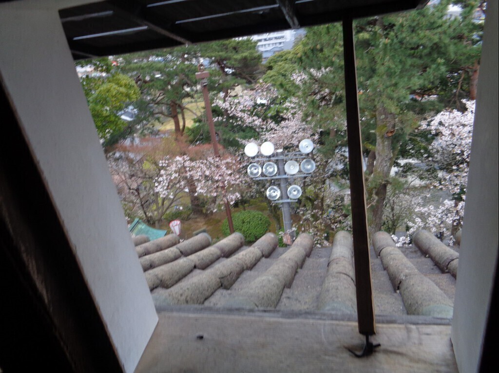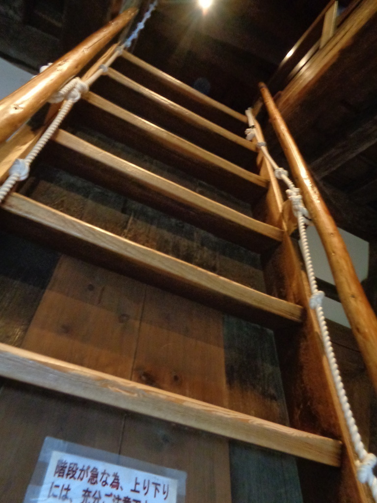 가파른 나무 계단 을 내려와서는 밖으로 나와 마루오카성(丸岡城) 을 뒤로 하고