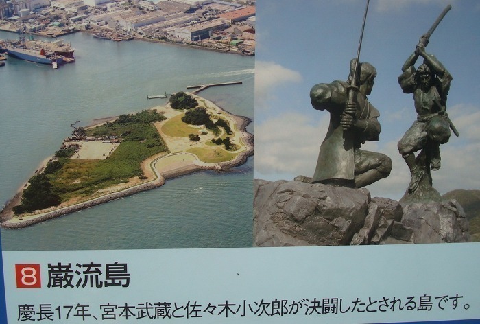 제비섬 간류지마에는 코지로의 무덤 이 있고 결투장면 석조물 과 당시 타고 온 쪽배 가