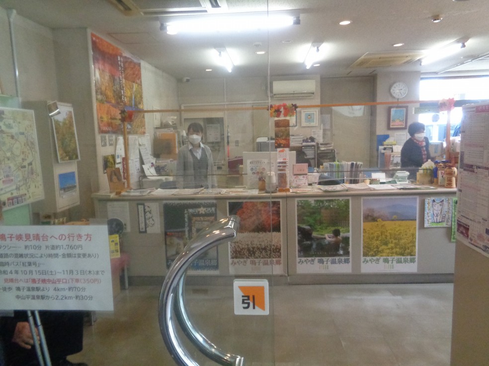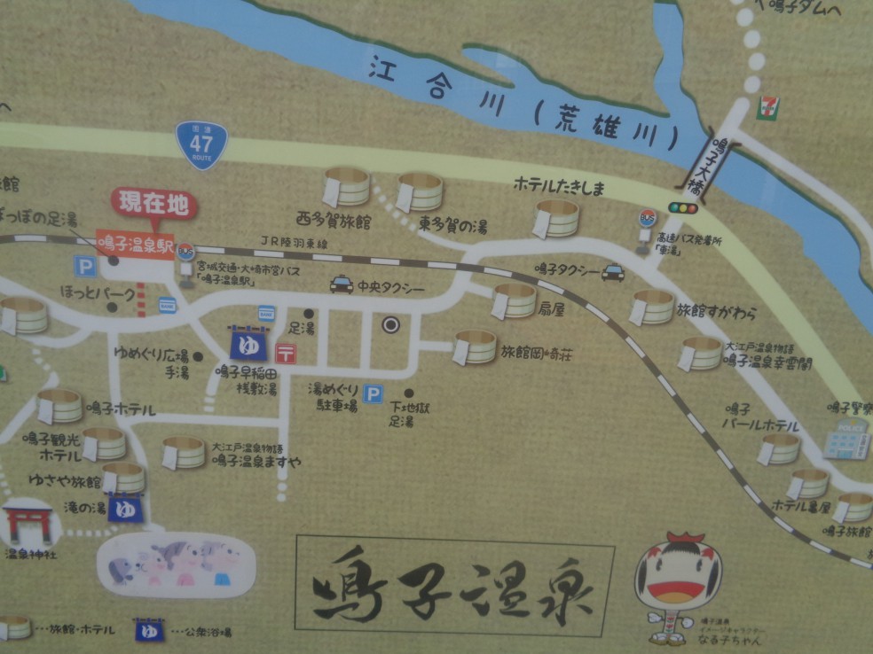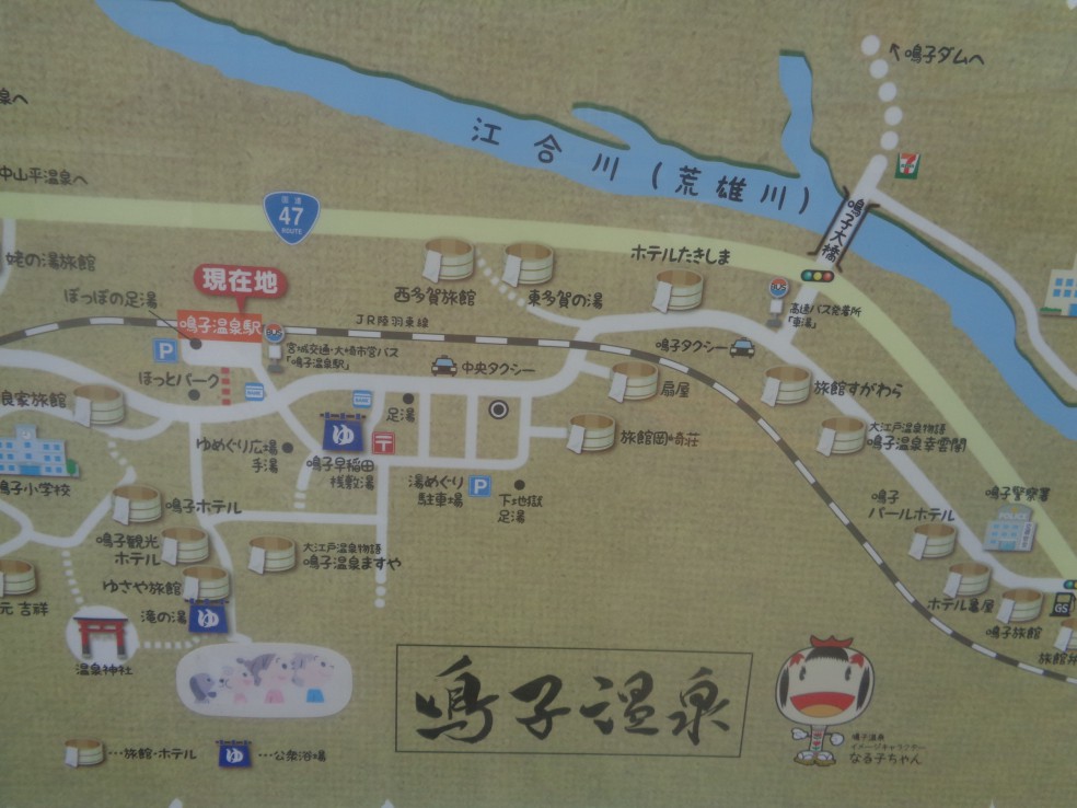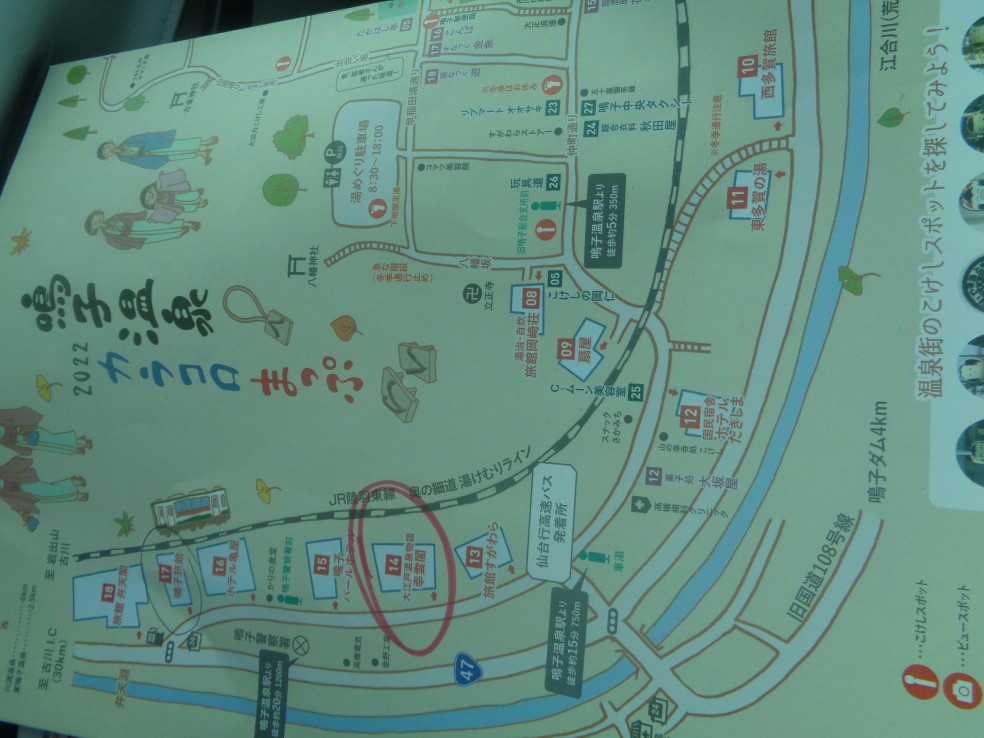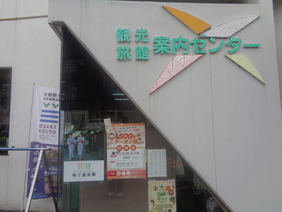 사전에 조사하기로는 나루코역 앞 宮城県大崎市鳴子温泉字湯元 2-2 번지에 오사키시 나루코 관광·료칸안내