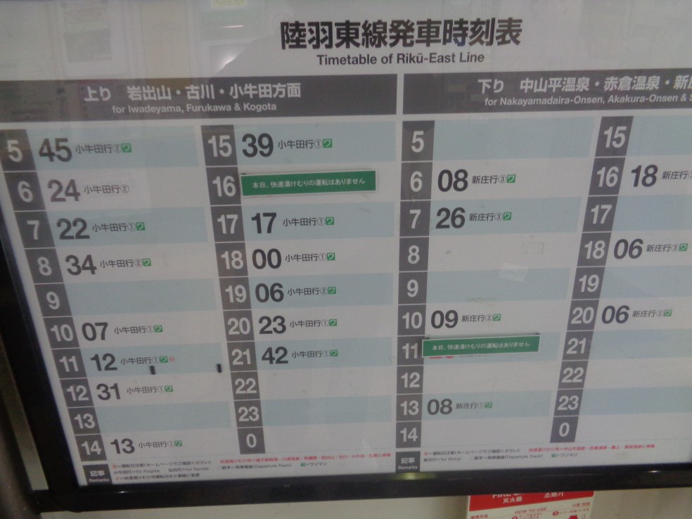 1시간 만에 신조 新庄(신장) 역에 내려서는 바로 옆 선로에서 코고타(小牛田) 행 기차를 탑니다.