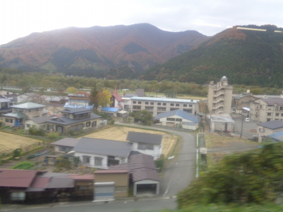 그러고는 히가시 리쿠우 선(고우시다 선) 기차는 시내를 빠져나와 과일과 채소를 경작하는 들판을