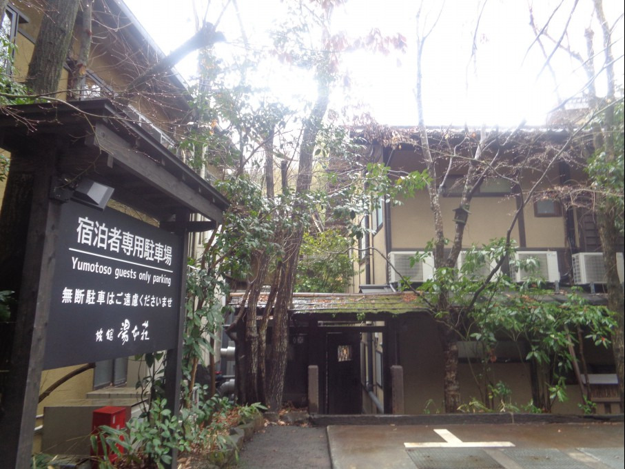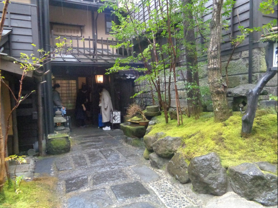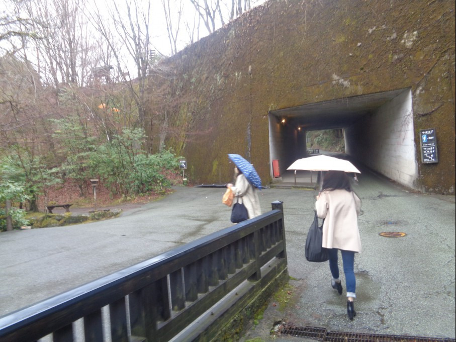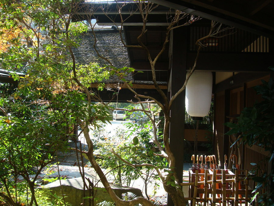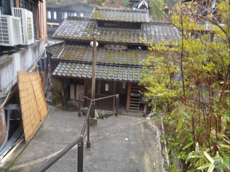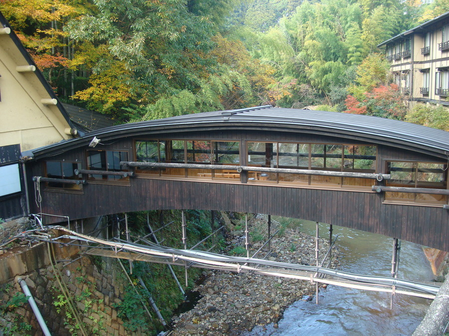 료칸(여관) 으로 들어가 내부를 통과해 다시 안으로 들어가 계곡에 걸린 다리 를 지나니