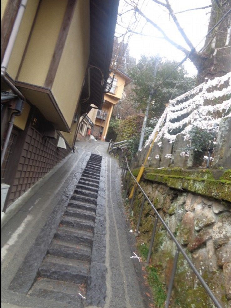 내리막 도로를 돌아 내려가니 오른쪽에 예약한 와카바 여관 이 있고 그 옆으로 도로에서 내려오는 가파른 계단