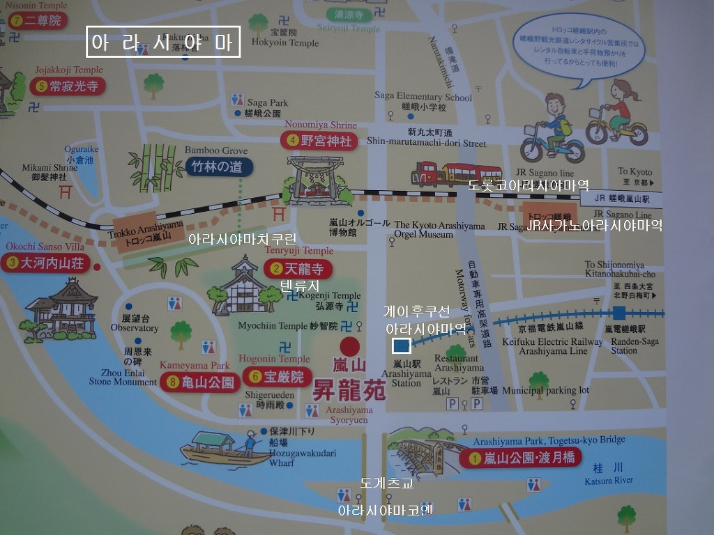 교토 시내 서북쪽에 헤이안 시대 귀족의 별장들이 모여있던 아라시야마 (嵐山あらしやま) 는