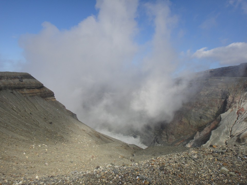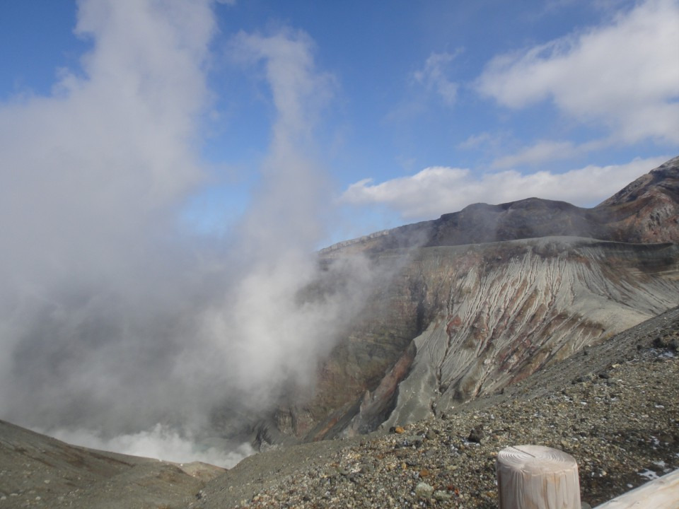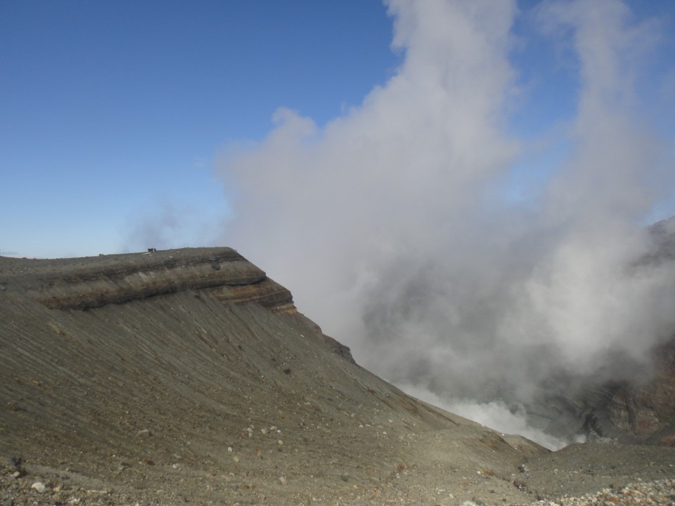 아님 버스를 타야 한다고 적혀 있으며, 분화구 근처에 이르니 유황냄새가 진동합니다.